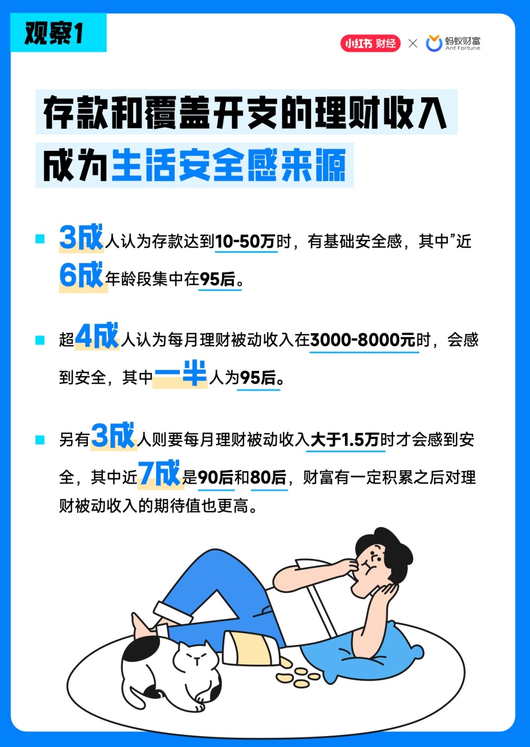 据小红书&蚂蚁财富平台共同发起的《避险青年调研报告》发现,不少年轻人在谈及“生活安全感”时,强调存款和能够覆盖日常支出的理财收入,是他们重要的安全感来源。其中,3成年轻人认为存款达到10-50万时,超4成人认为每月理财被动收入超过3000元时,更有安全感。