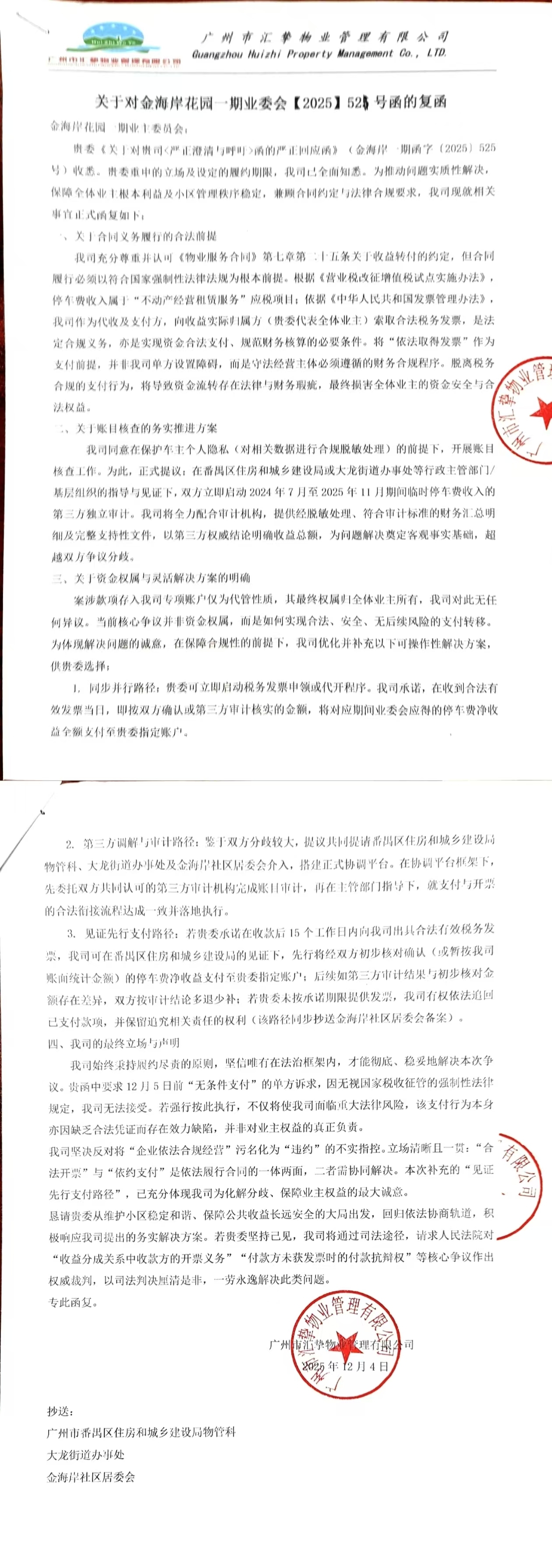 12月4日,广州市汇挚物业管理有限公司回复业委会称,“根据《营业税改征增值税试点实施办法》,停车费收入属于‘不动产经营租赁服务’应税项目;依据《中华人民共和国发票管理办法》,我司作为代收及支付方,向收益实际归属方(贵委代表全体业主)索取合法税务发票,是法定合规义务,亦是实现资金合法支付,规范财务核算的必要条件。将‘依法取得发票’作为支付前提,并非我司单方设置障碍,而是守法经营主体必须遵循的财务合规程序。”公司同意在保护车主个人隐私(对相关数据进行合规脱敏处理)的前提下,开展账目核查工作。为此,正式提议:在番禺区住房和城乡建设局或大龙街道办事处等行政主管部门/基层组织的指导与见证下,双方立即启动2024年7月至2025年11月期间临时停车费收入的第三方独立审计。