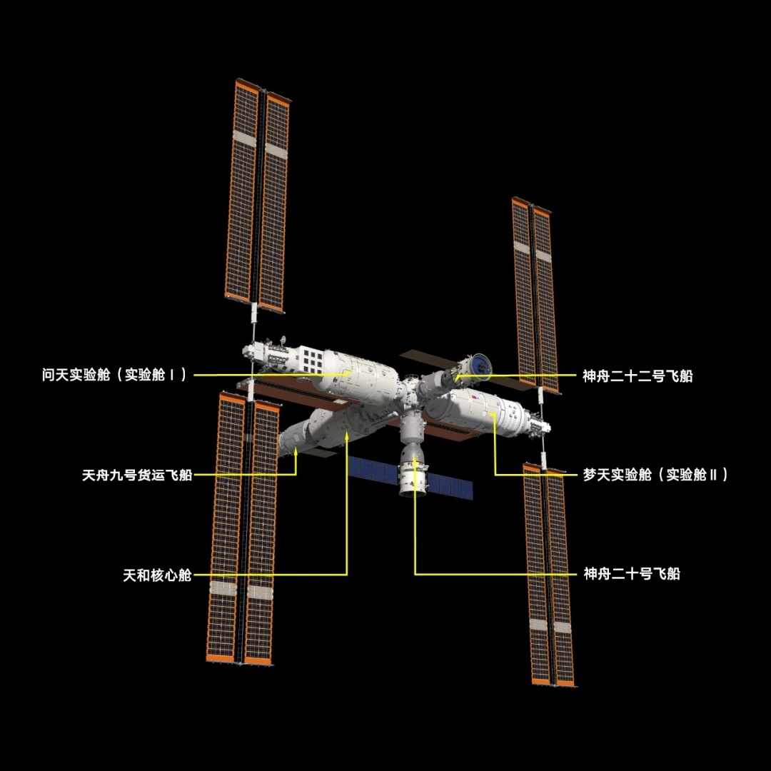 神舟二十二号飞船对接完成后的空间站示意图 | X/@SegerYU