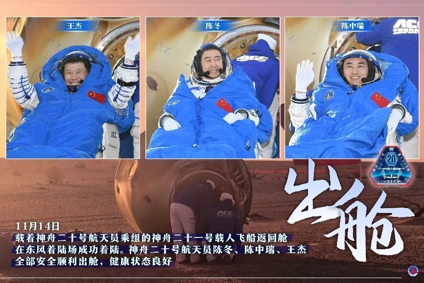 2025年11月14日,神舟二十一号飞船顺利返回东风着陆场,神舟二十号航天员陈冬、陈中瑞和王杰平安着陆。三人此次在轨飞行203天,刷新了中国航天员单次在轨时长纪录。