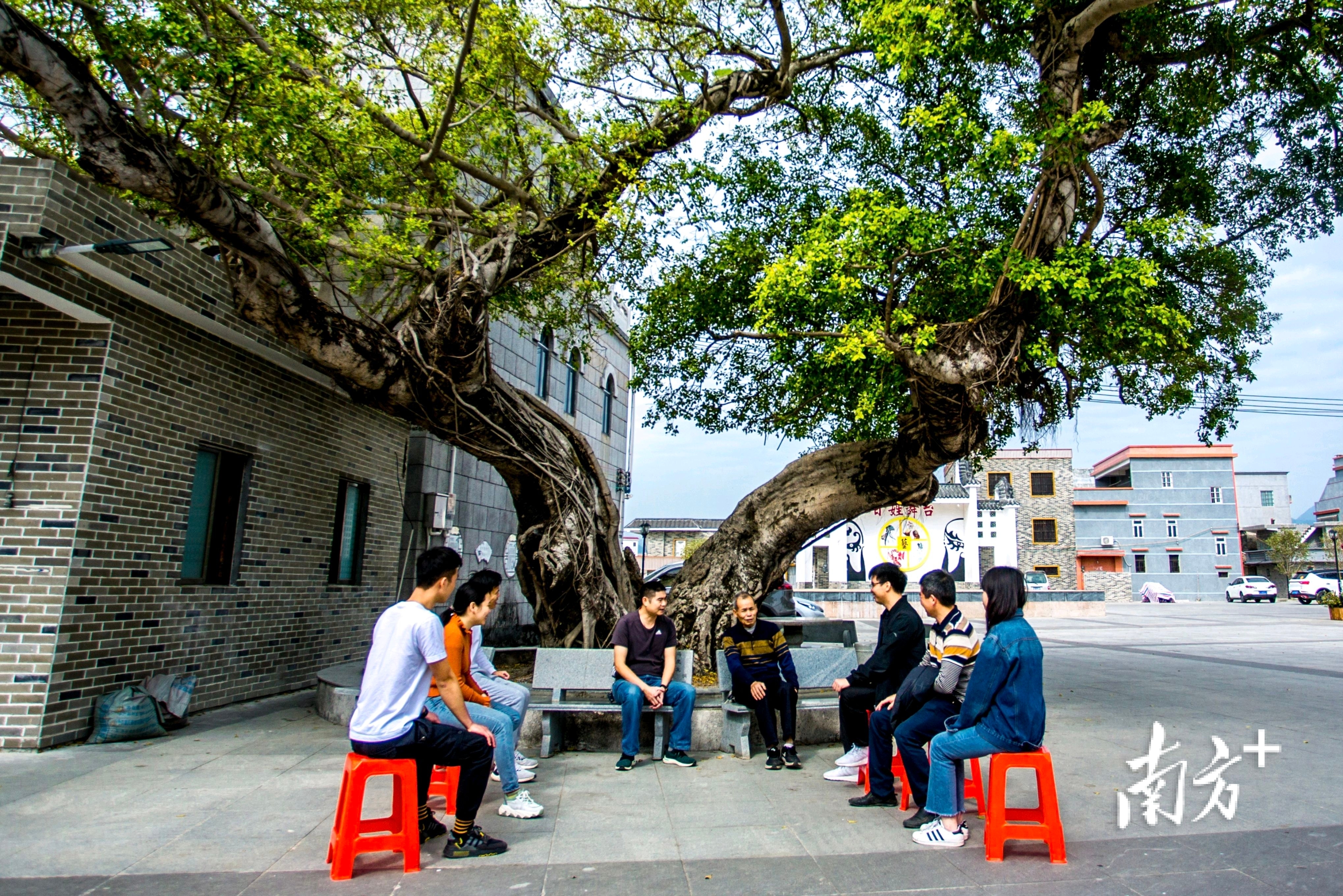 恩平“住村”干部(左一与右一)与村民在榕树下聊天。受访者供图