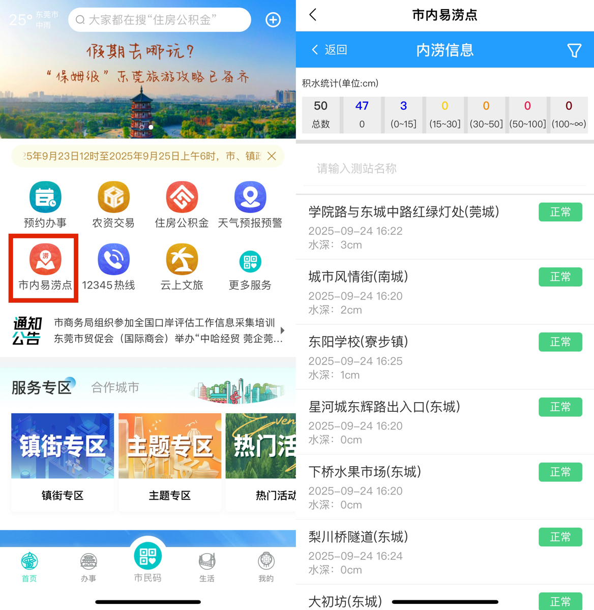 持续性强降水极易引发城市内涝,如何避免路上被困?“i莞家”App“市内易涝点”功能可一键查询全市易涝点实时积水情况,助你科学规划路线,安全出行!
