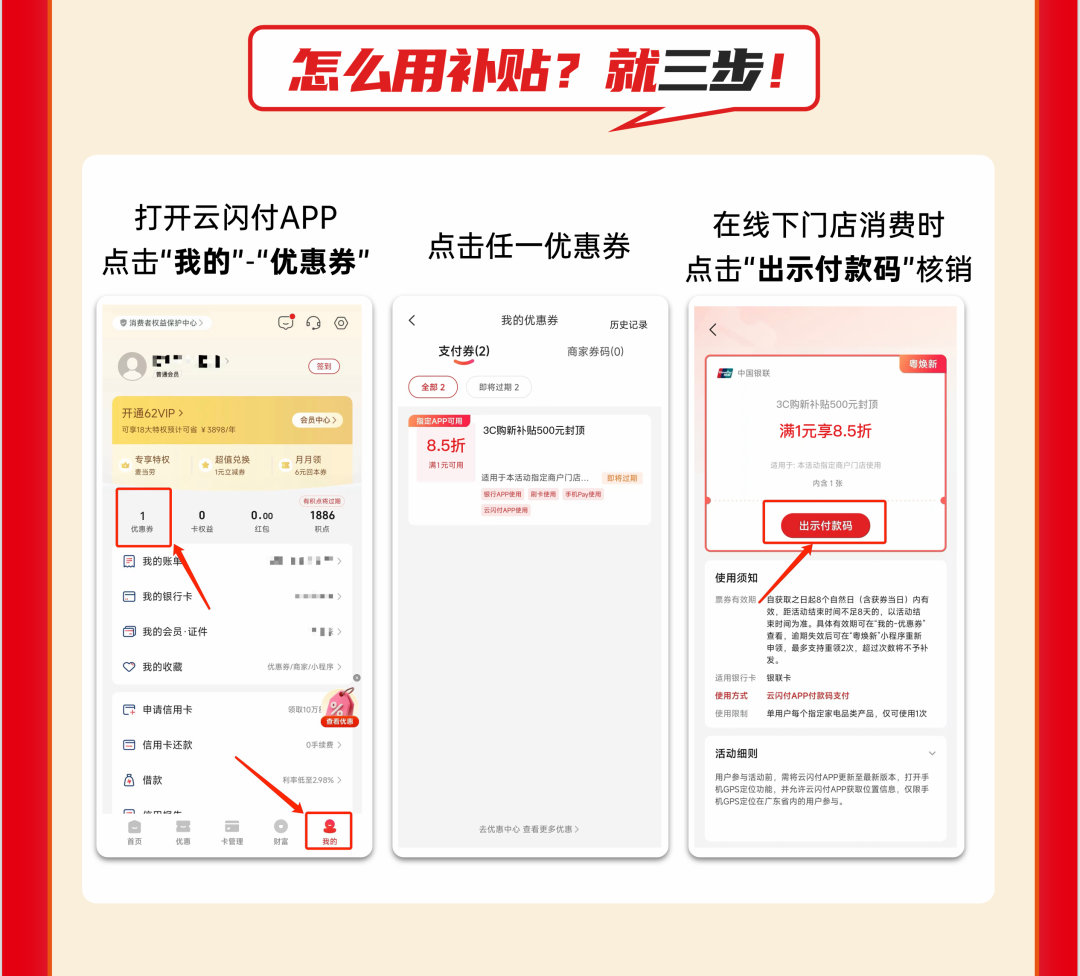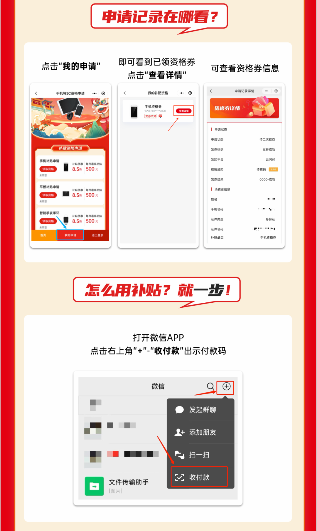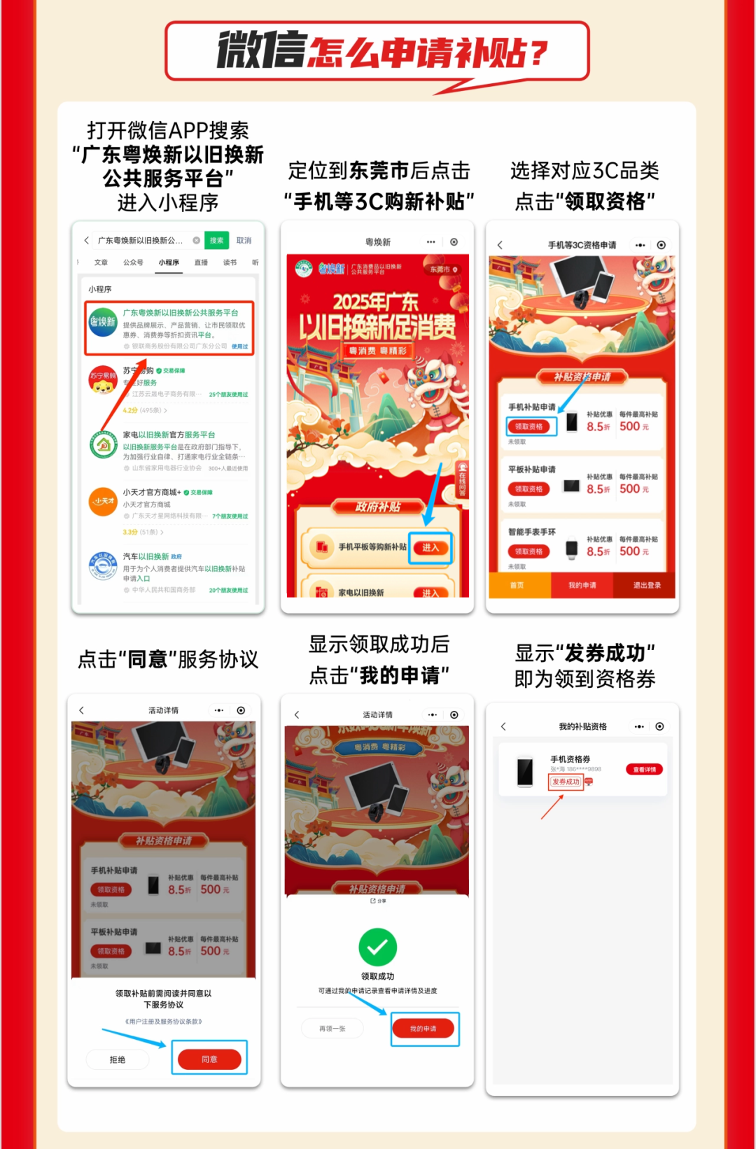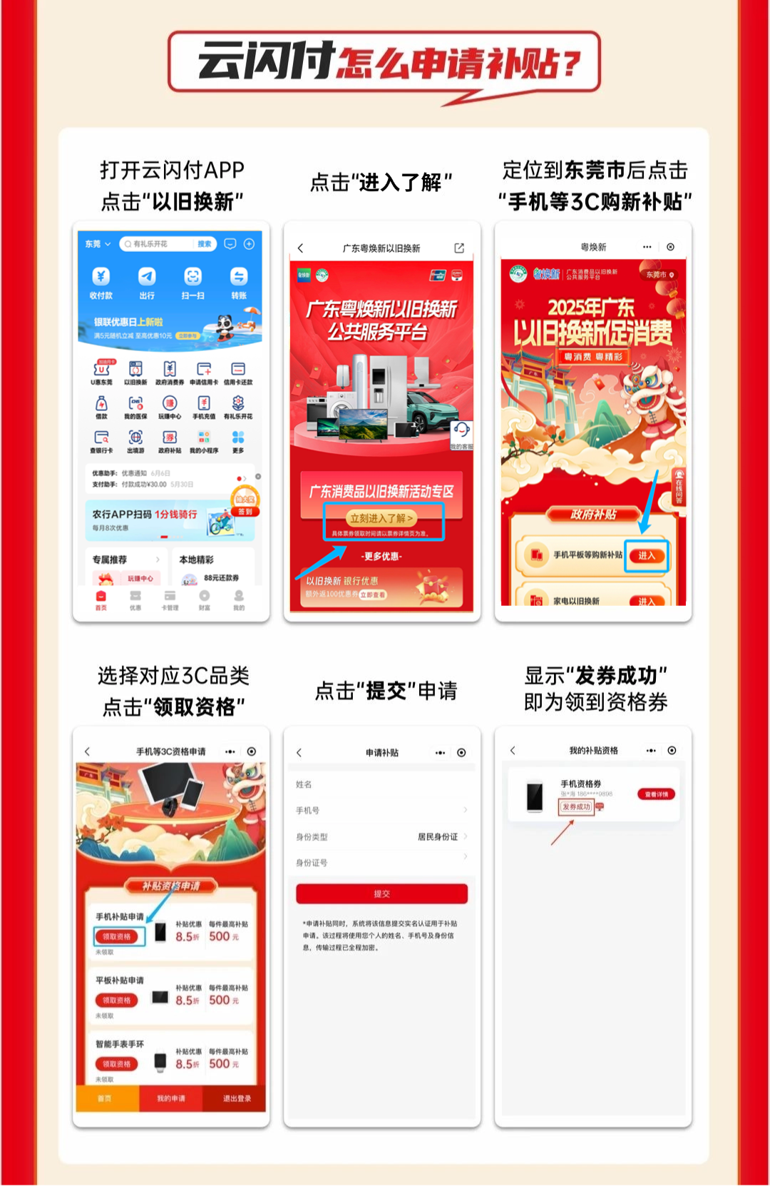 👉活动期间,消费者登录“广东粤焕新以旧换新公共服务平台”小程序或云闪付平台,申领手机、平板、智能手表(手环)等3类数码品类补贴资格券,在参与活动的3类数码销售企业线下购买指定品类产品,使用领取资格券的APP的付款码展码支付,即可享受优惠补贴。