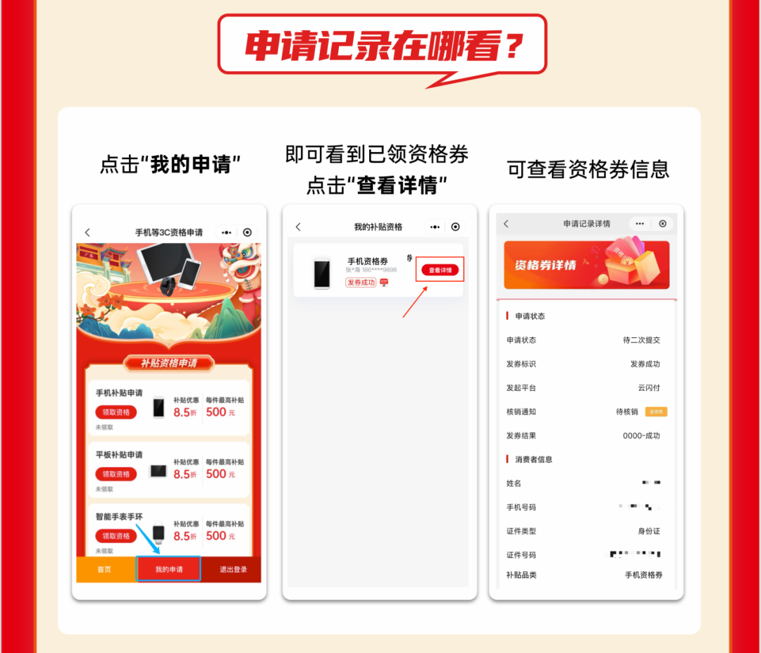 👉手机、平板、智能手表(手环)类资格券有效期为3天。每名消费者有3次领券资格,补贴资格券只能核销一次,成功核销后,不再具备领券资格。消费者每类产品可补贴1件,按产品销售价格的15%给予补贴,每件补贴不超过500元,单件销售价格不超过6000元。需现场拆开包装并完成激活。