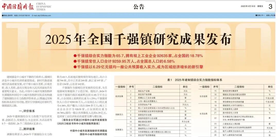 2025年建制镇综合实力指数下设经济发展、创新活力、发展潜力、生态宜居、生活品质等5个一级指标、26个二级指标。