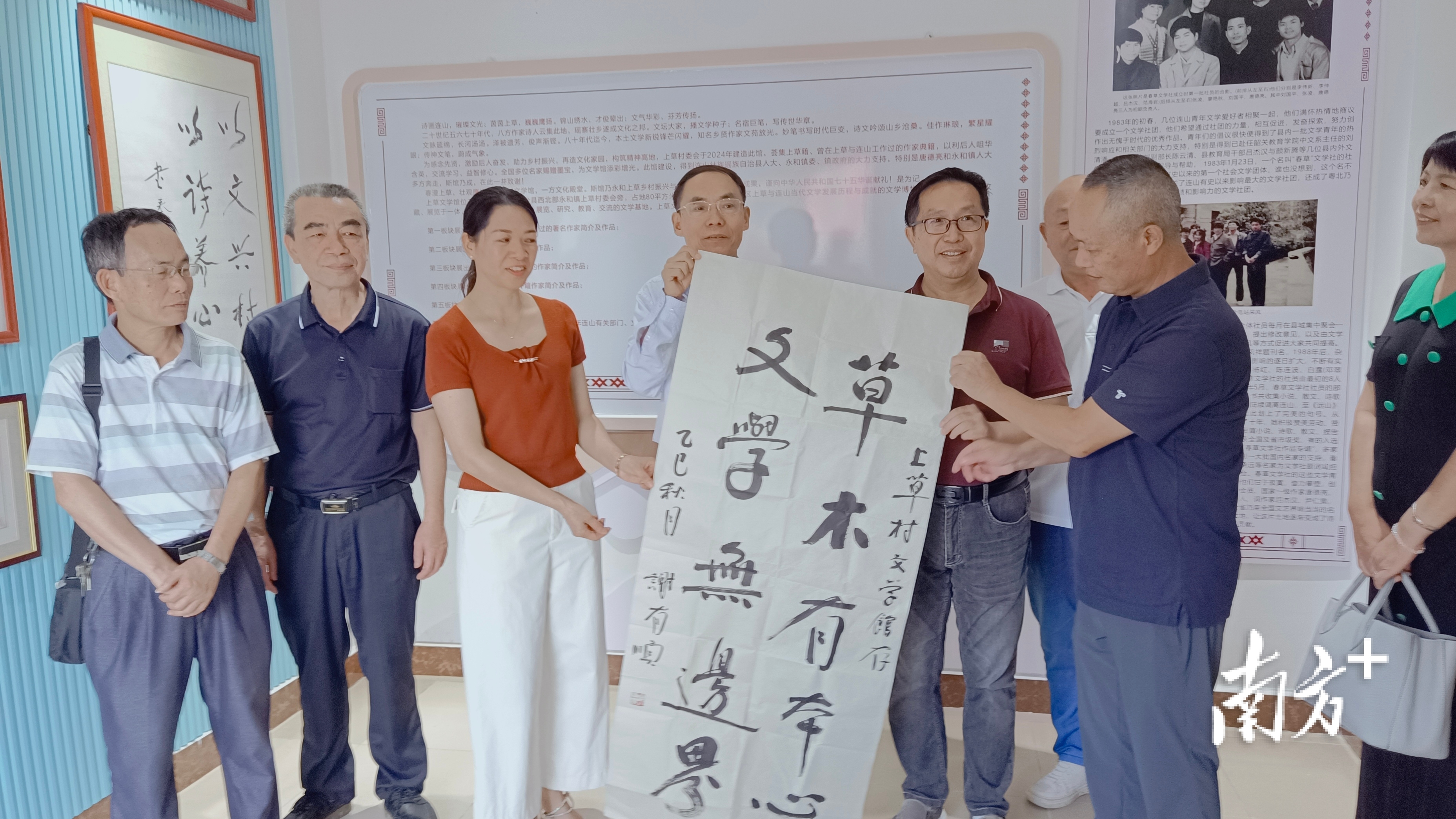 “‘草木有本心,文学无边界’,谢主席这笔墨不仅是对上草文学馆的寄语,更是对我们乡村文学生命力的最好诠释!”9月27日,广东连山壮族瑶族自治县永和镇上草村文学馆内,墨香与书香交融。著名作家、广东省作协主席谢有顺向该馆赠送墨宝和一批文学专著,阳光透过窗棂洒在泛黄的旧手稿与崭新的图书上,映照出上草村六十余载文学薪火的生生不息。