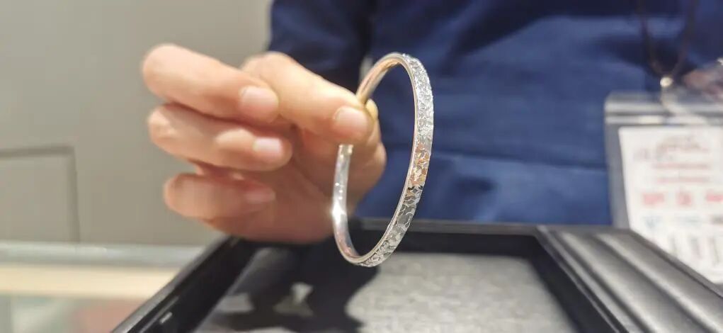 2024年6月6日,在北京一家商场金店内,店员展示到货的银手镯。新华社记者任军 摄