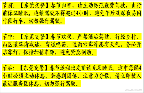 其次便是短信提醒“心贴心”。东莞金融监管分局指导各财险公司在保障个人信息安全的前提下,联合交管部门重点关注“两客一危一货”、“返乡车”“7-9座包车”等车型,分风险节点和风险类型,于春节前、中、后等时点通过短信/彩信精准推送安全提示,切实提升相关人员交通安全意识。