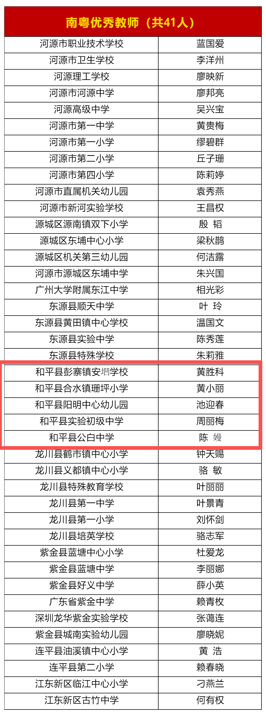 此次评选中,河源市41人被评为南粤优秀教师,4人被评为南粤优秀教育工作者,22人被评为省特级教师。其中,和平县共5人被评为南粤优秀教师。据悉,获奖者中既有长期坚守教学一线、育人成效卓越的基层教师,也有勇于探索教育改革、推动数字化转型的学科带头人;既有在思政教育、德育工作中表现突出的优秀工作者,也有扎根乡村、奉献青春的“乡村筑梦人”;既有精通业务、教学成果显著的“专家型”教师,也有在管理服务岗位上默默奉献的教育工作者。
