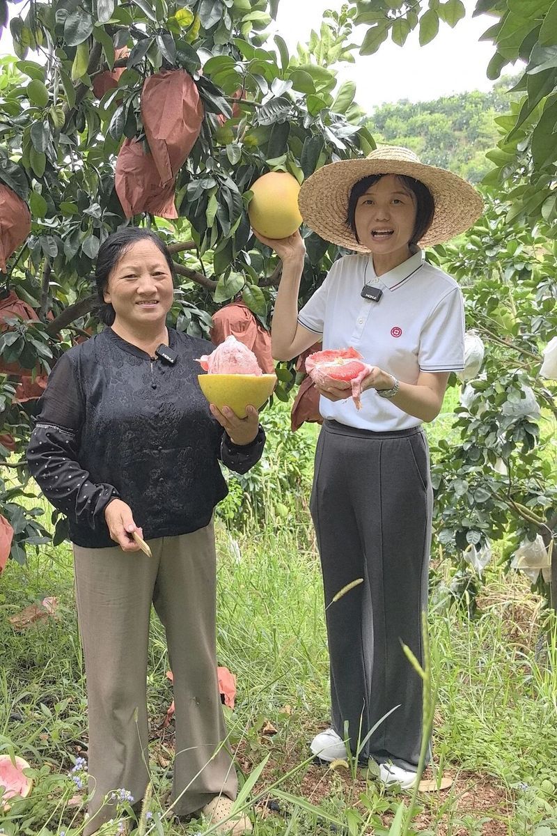 “朋友们,我手上这颗就是长坝村的三红蜜柚,果皮泛红像少女腮红,柚绵粉嫩,果肉是喜庆的中国红,颜值口感双在线!”上午8时30分,盟大集团党支部书记、东莞优品乡村振兴特派员沈双手持蜜柚,对着镜头热情推介。直播现场,她当场切开一颗蜜柚,红润晶莹的果肉瞬间吸引目光,柚香仿佛穿透屏幕。“中秋快到了,柚子象征团圆,大家以买代帮,既能尝时令鲜果,又能助农增收,特别有意义!”沈双的话语打动了众多网友,直播间里“莞韶一家亲”“已下单支持助农”“给北方朋友带广东中秋神果”的留言刷屏,评论区成为温暖的助农接力场,爱心在点赞、分享与下单中不断传递。