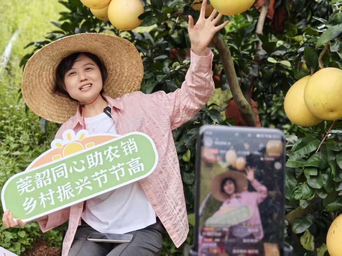 清晨时分,柚农们已穿梭在柚林间忙碌:手法娴熟地摘下饱满蜜柚,再一筐筐转运至集中点,脸上满是丰收的喜悦。与此同时,柚林旁的“莞韶同心‘柚’见甜蜜”公益直播助农活动正式开播。该活动由莞韶指挥部、韶关市农业协会、盟大集团旗下东莞优品平台、品质东莞电商直播基地联合主办,东莞市互联网行业党委、东莞市个体私营企业党委、东莞市非公经济组织党委及东莞百家支部心连心共建平台多方支持,开播仅1小时便售出蜜柚100多单。