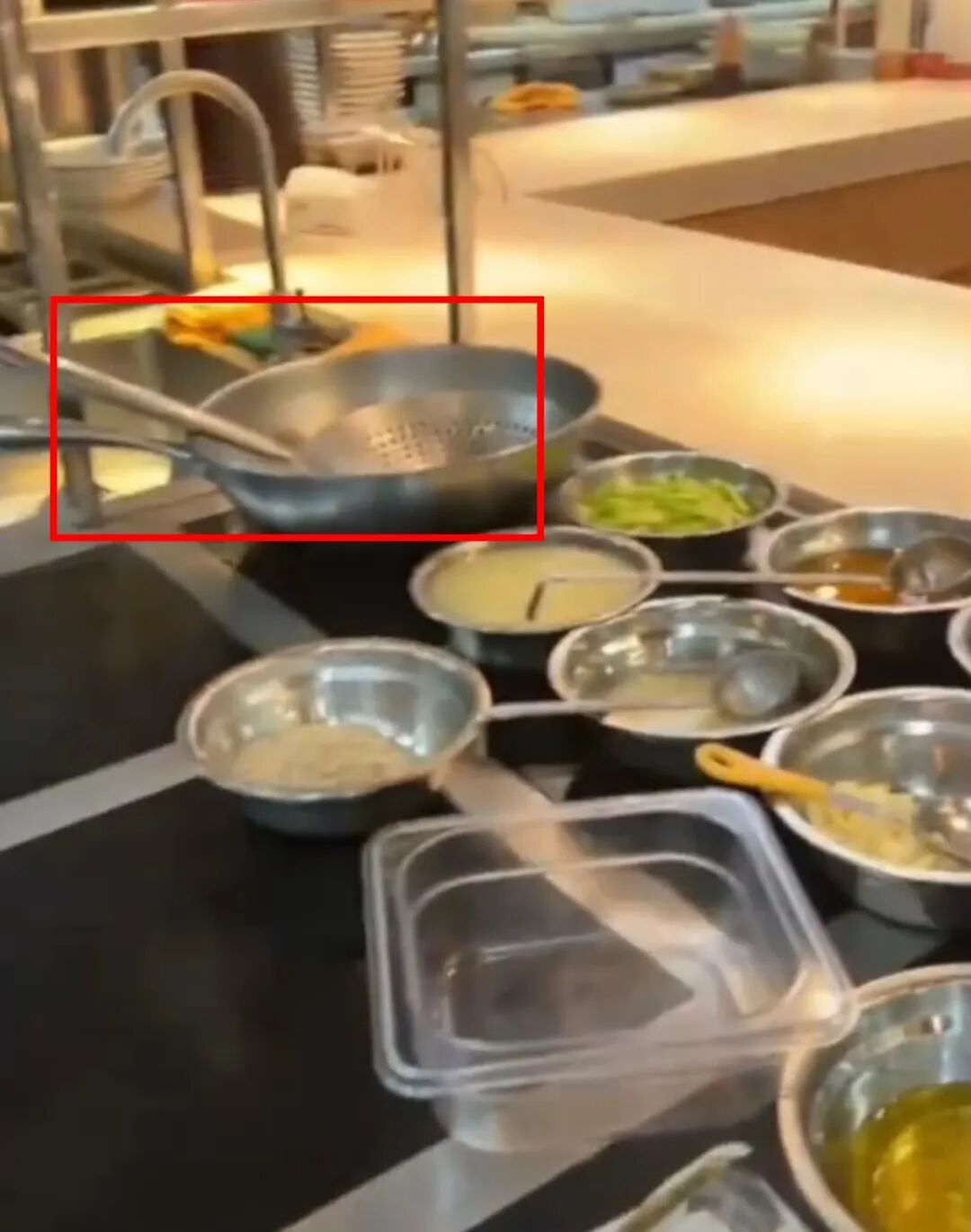 9月14日,极目新闻记者注意到,一段视频中,员工用不锈钢漏勺疏通下水道,漏勺上没有明确的用途标识。另一段视频显示,下水道一旁的操作台上,锅里放着一个不锈钢漏勺,与疏通下水道的漏勺相似。