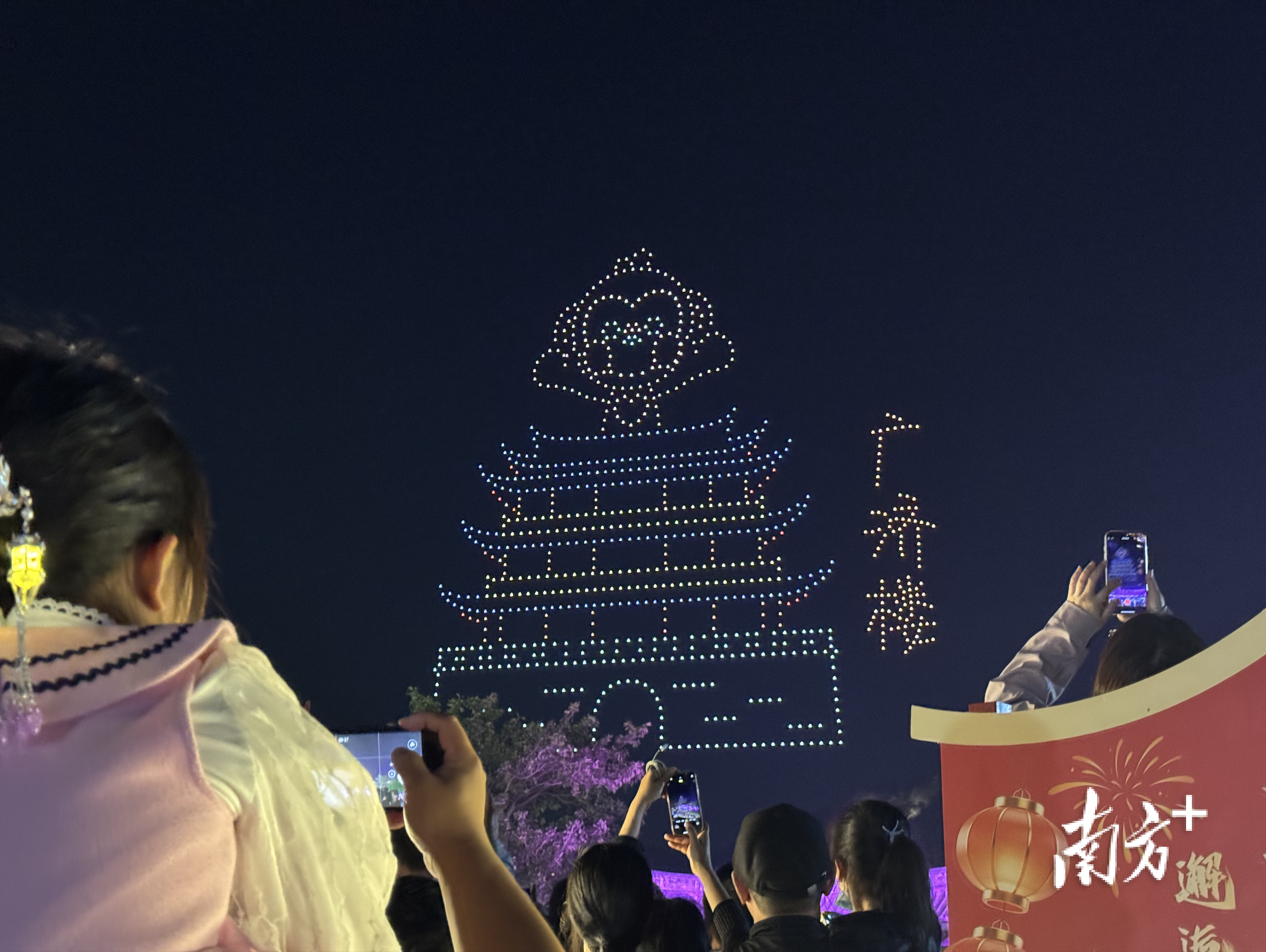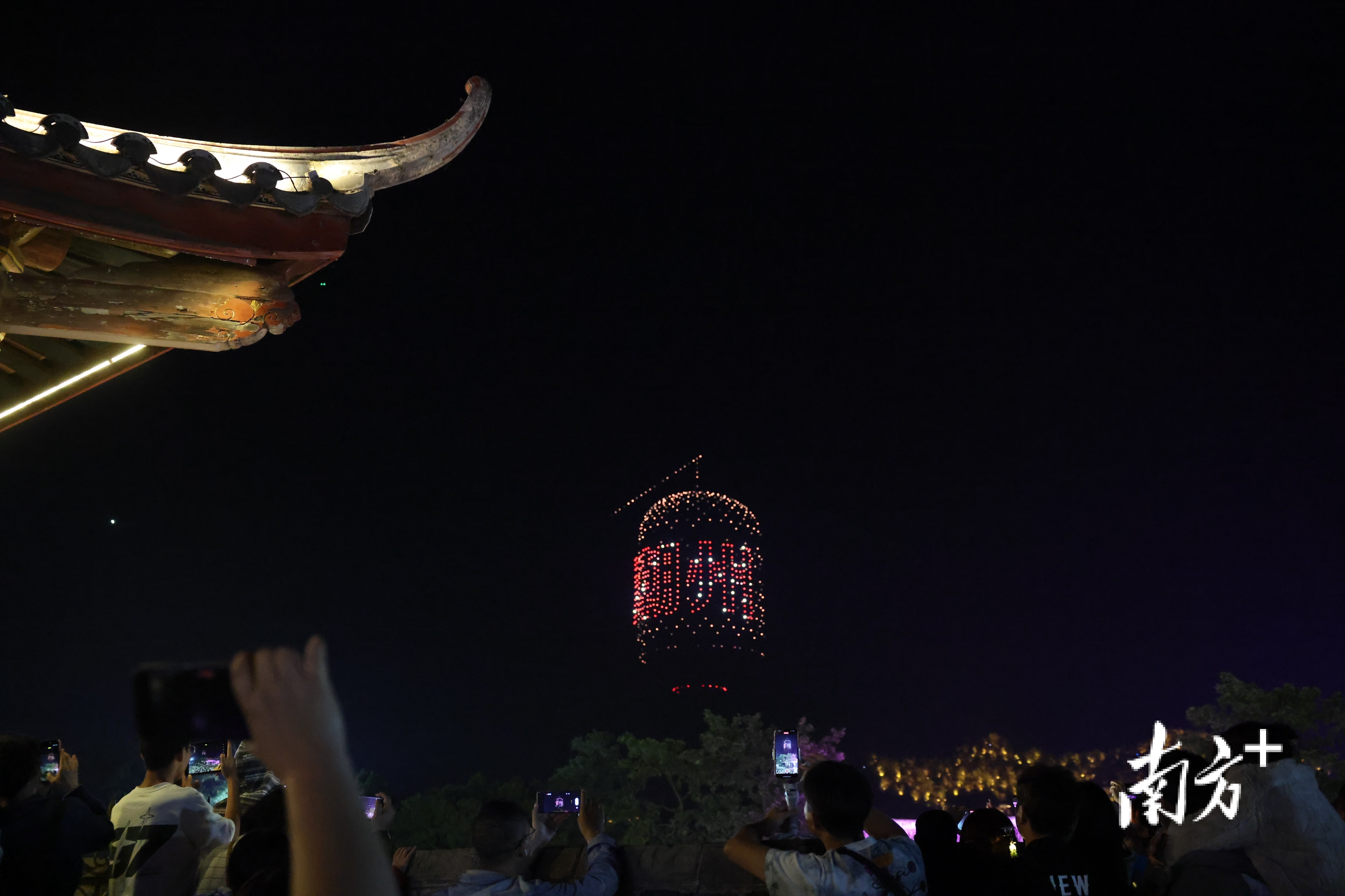 “哇!这个等得值。”来自江西的游客许先生看到关于无人机演出活动的宣传,一早就来到潮州古城广济楼城墙上等待。当无人机阵列飞上韩江上空,组合成一个闪耀着“潮州”字样的精美灯笼,许先生不禁发出感慨。