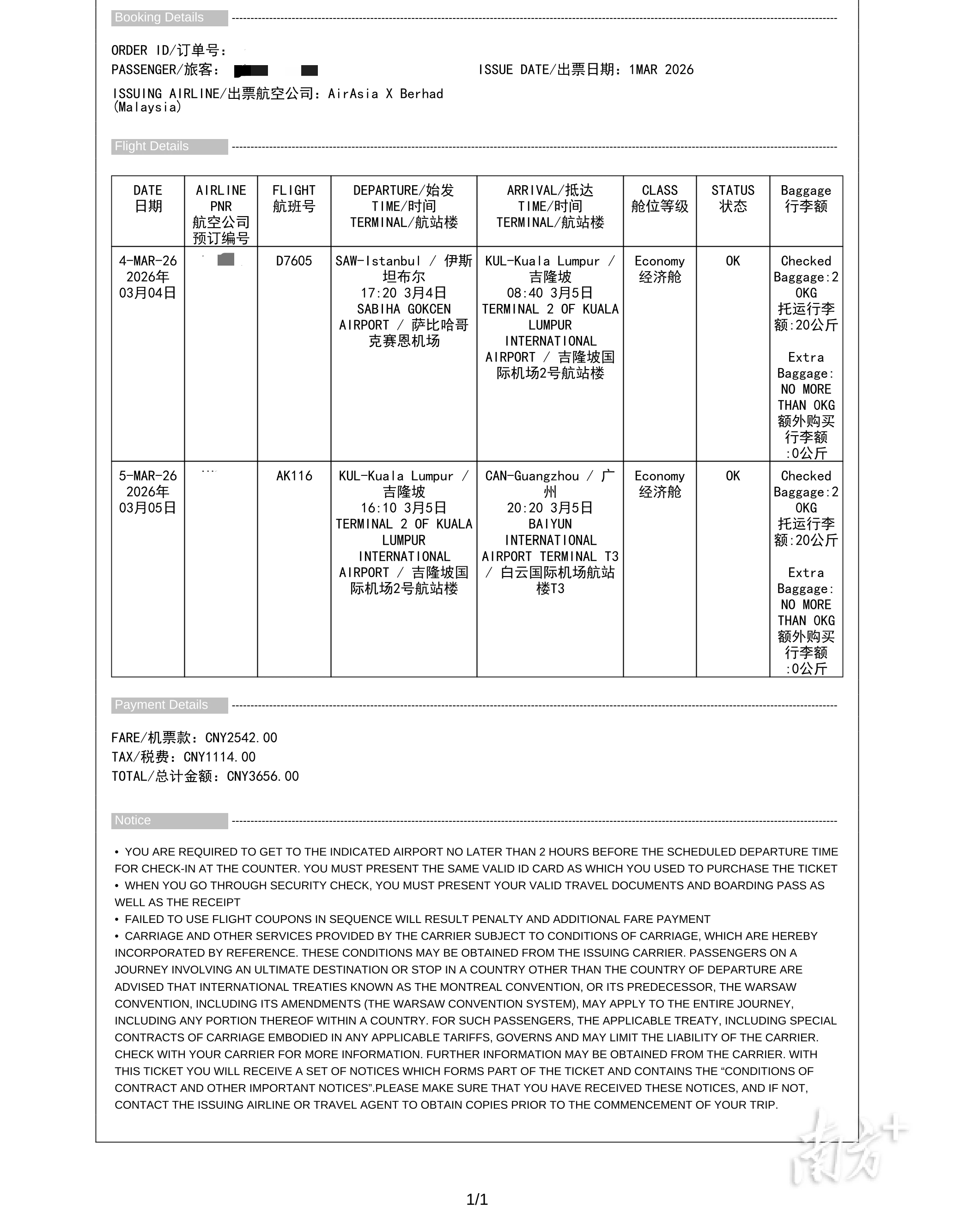 3月4日从伊斯坦布尔经吉隆坡转机回广州的机票。受访者供图