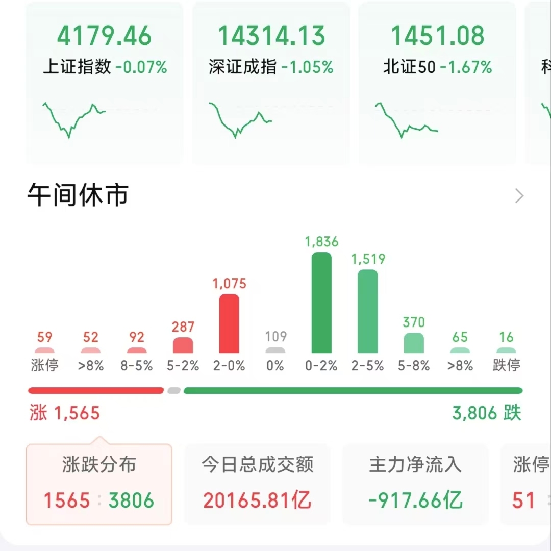 截至午间收盘,主要指数集体下跌。沪指在权重股护盘下一度摸高4197点,再度刷新近十年纪录,后续又回调,微跌0.07%;深成指受科技成长股调整影响,跌幅1.05%;创业板指下跌0.44%。科技股回调导致科创50指数大跌3.21%。