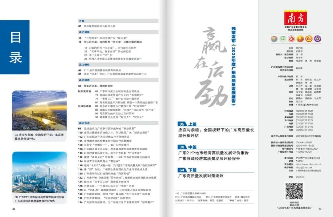 《南方》杂志推出的《赢在后劲——独家发布〈2025年度广东高质量发展报告〉》特刊,不仅对广东和21个地市的经济发展和后劲进行了深入的分析解读,还聚焦创新发展、区域协调等问题提出大量有针对性的建议,既有大量的数据支撑,也有鲜活的发展案例,对政协委员建言献策带来许多启发,是一本值得一读的省情参考资料。