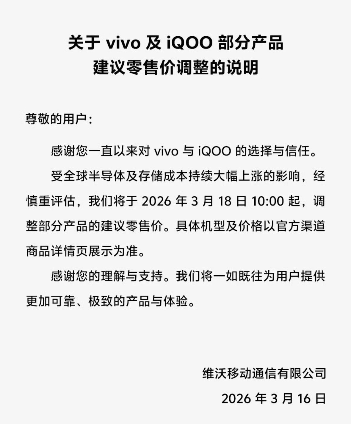3月16日,vivo发布公告,宣布将于3月18日上午10时起,对vivo及iQOO品牌部分在售产品的零售价格进行调整。