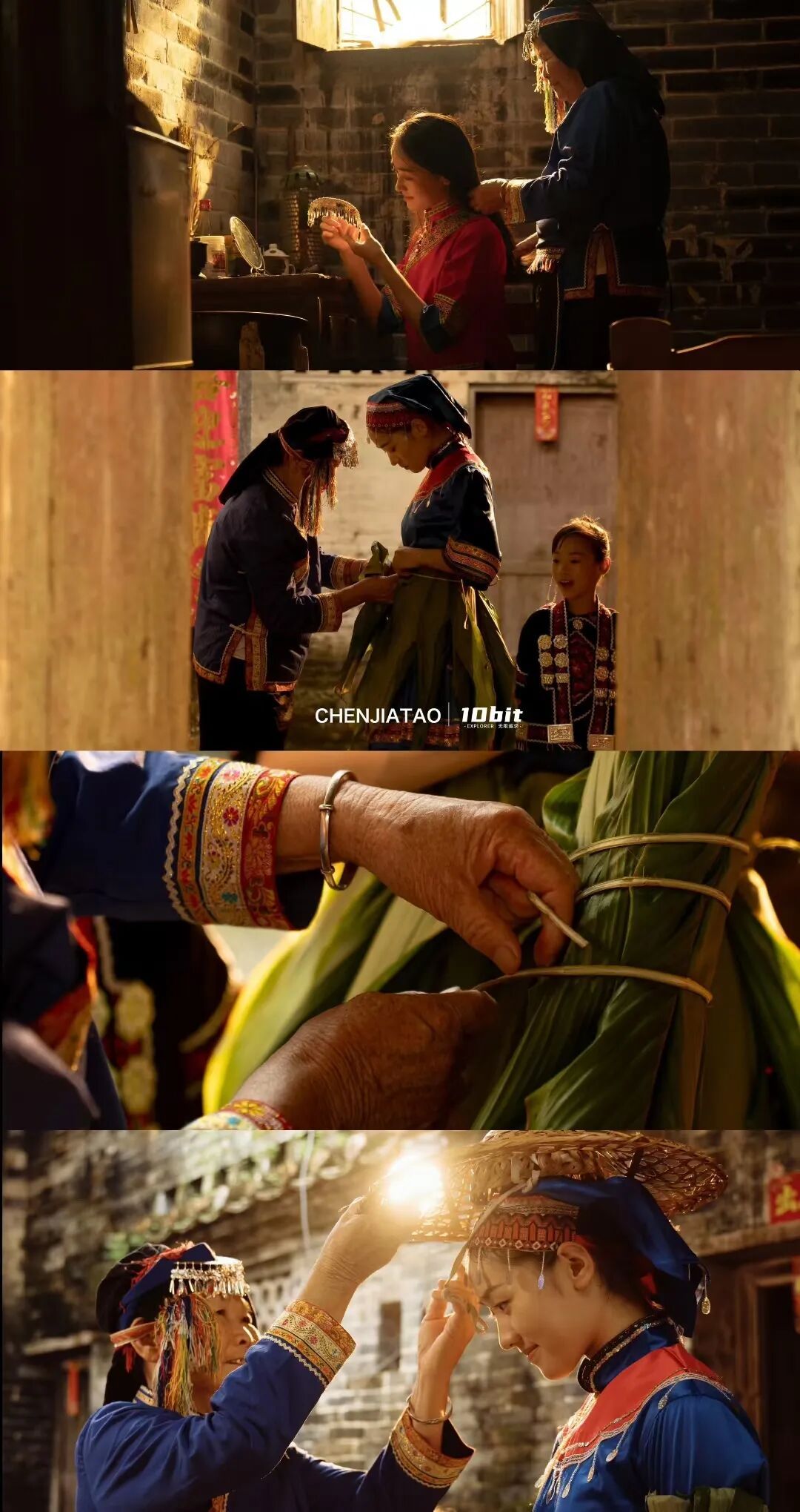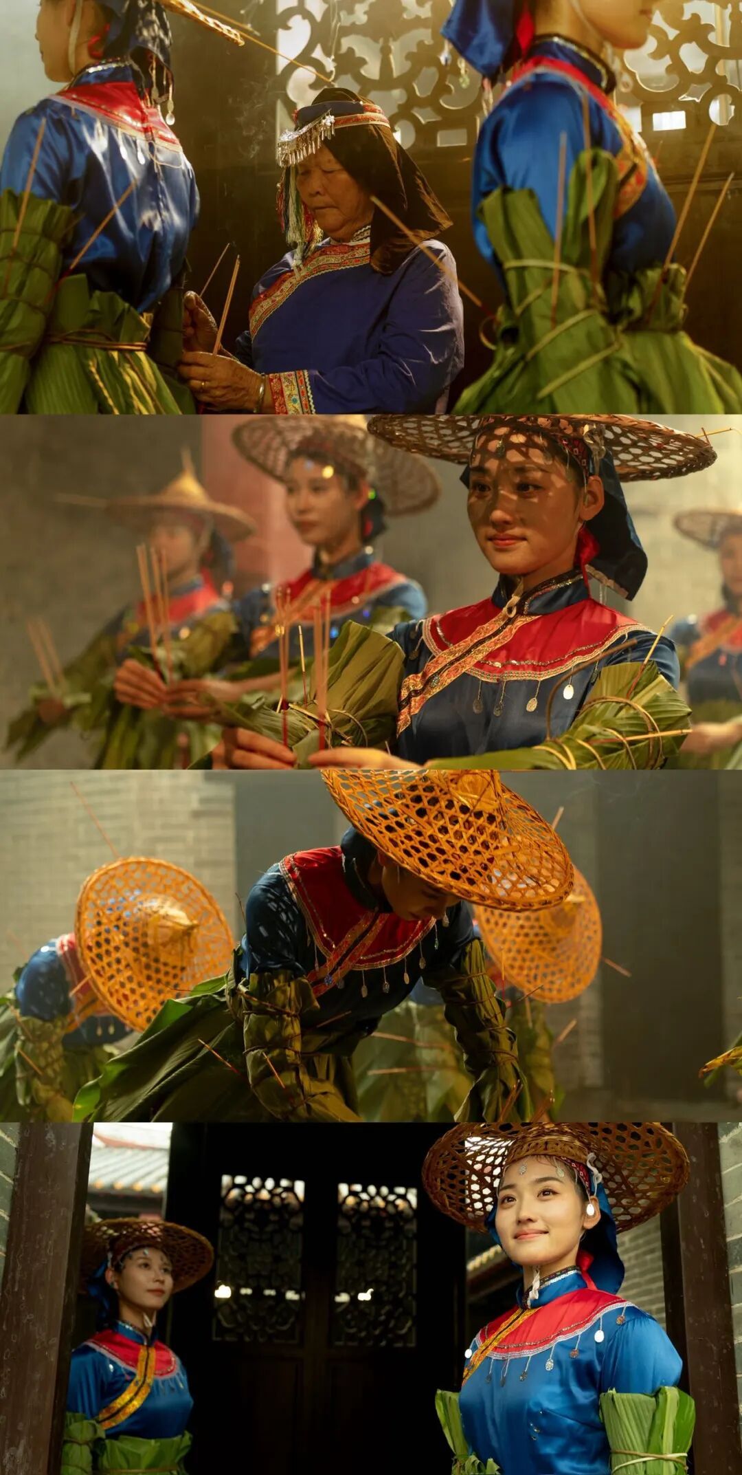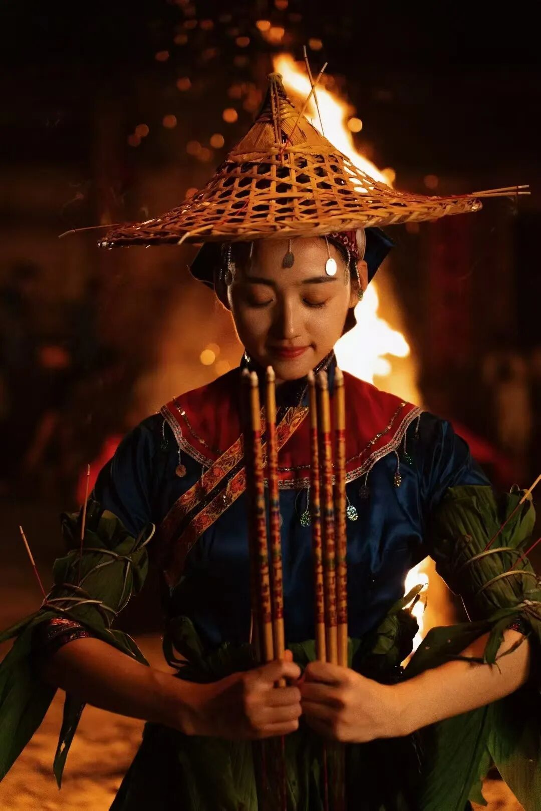 对于蓝田瑶族的少女而言,《舞火狗》更是一场神圣的成年礼——十五至十八岁的瑶族未婚少女,必须参加舞火狗活动,才能向族人宣示自己成年,正式进入谈婚论嫁的行列。每到中秋夜,这场充满仪式感的民俗活动便会在蓝田瑶乡拉开帷幕。未婚姑娘们先在地塘集中,由村里两位年长有“福份”的妇女为其装扮,手臂、腰部用山藤缠上黄姜叶(寓意铭记先祖生活的艰辛),头戴竹帽并插上香火,化身成灵动的“火狗”。