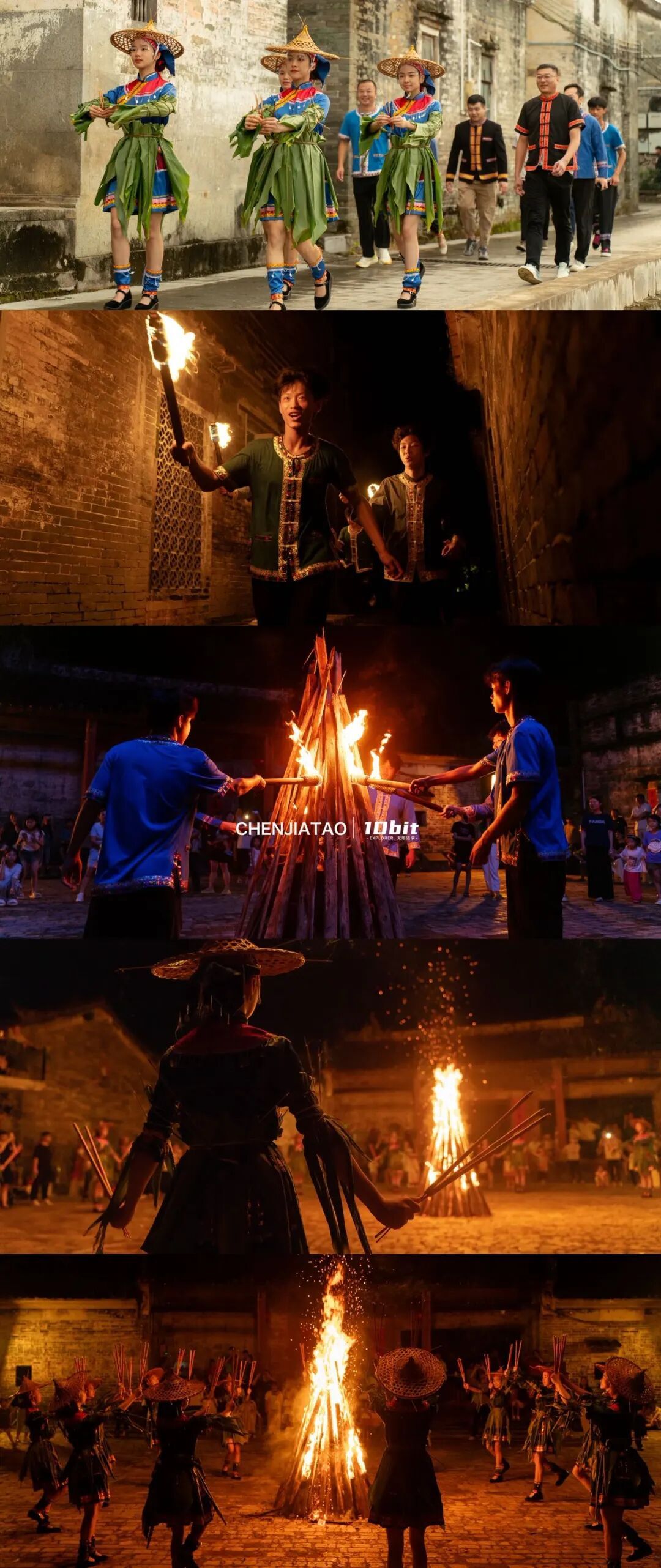 整场活动的高潮,当属火狗队的河畔之行——邻近各村的火狗队汇集在一起,队伍如长龙般蜿蜒游舞到村外河边,姑娘们将身上的黄姜叶、竹笠和香火统统扔入河中,再用河水濯洗手脚,象征着沐浴全身、祛除邪气,完成成年的洗礼。而在整个舞火狗过程中,瑶族男青年会全程在旁燃放鞭炮助威,待姑娘们洗罢手脚上岸,便会在河岸两侧选择意中人,以歌传情、对歌至天明,让庄重的成年礼,又多了几分浪漫的民俗风情。