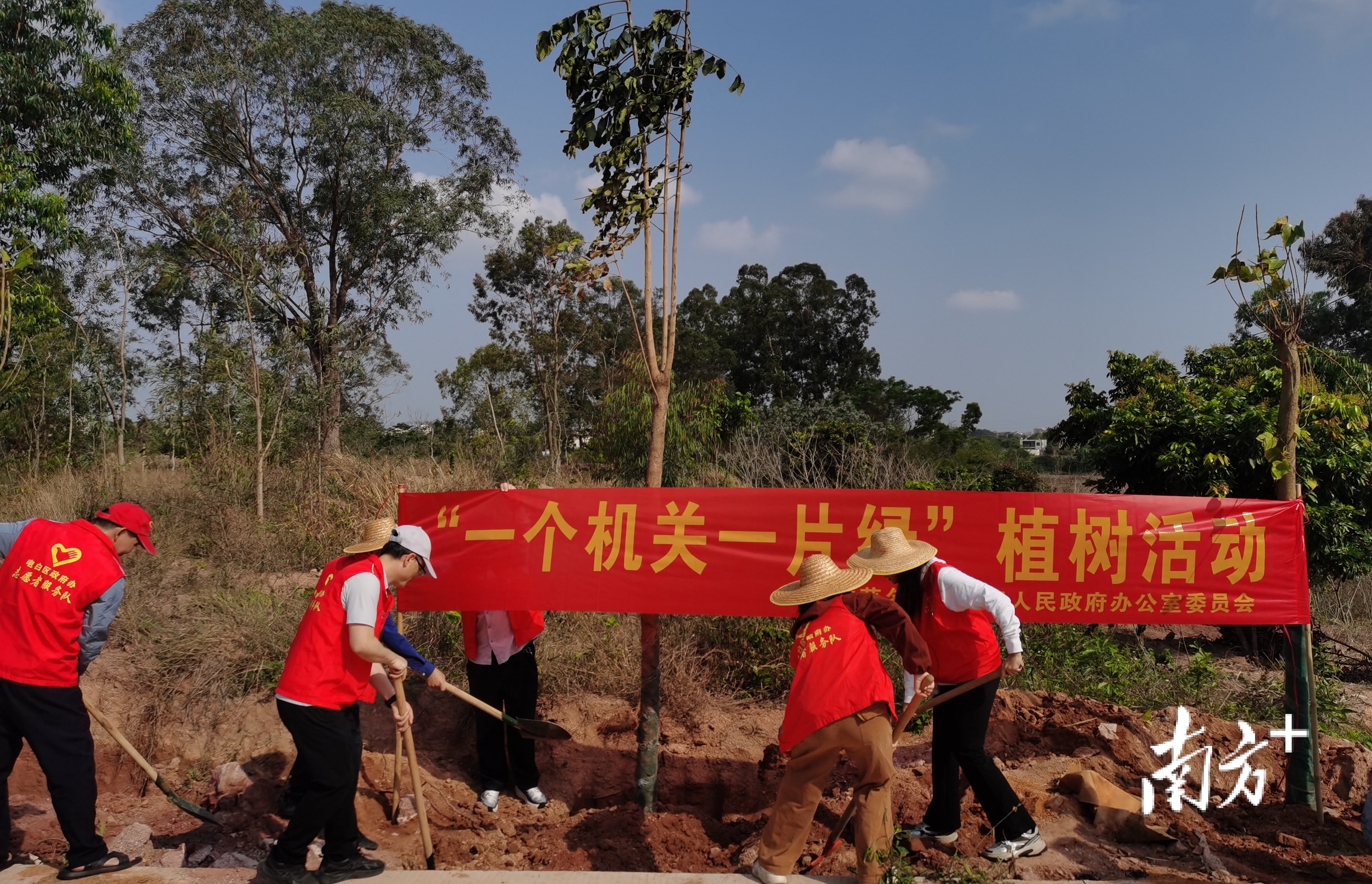 阳春三月,草木萌发。3月16日上午,在广湛高铁茂名南站周边乡村道路旁,人头攒动,旗帜飘扬,茂名市电白区多个机关单位、坡心镇村干部和村民们一起,撸起袖子、拿起铁锹,种下一棵棵新苗。