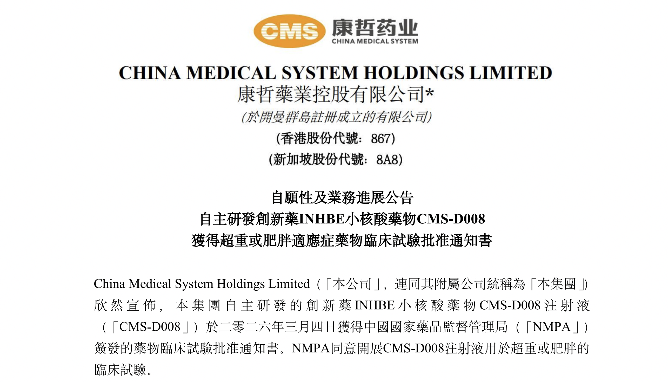 3月4日,康哲药业(00867.HK)发布公告,其自主研发的创新药INHBE小核酸药物CMS-D008注射液(“CMS-D008”)获得中国国家药品监督管理局(NMPA)签发的药物临床试验批准通知书,同意其开展CMS-D008注射液用于超重或肥胖的临床试验。