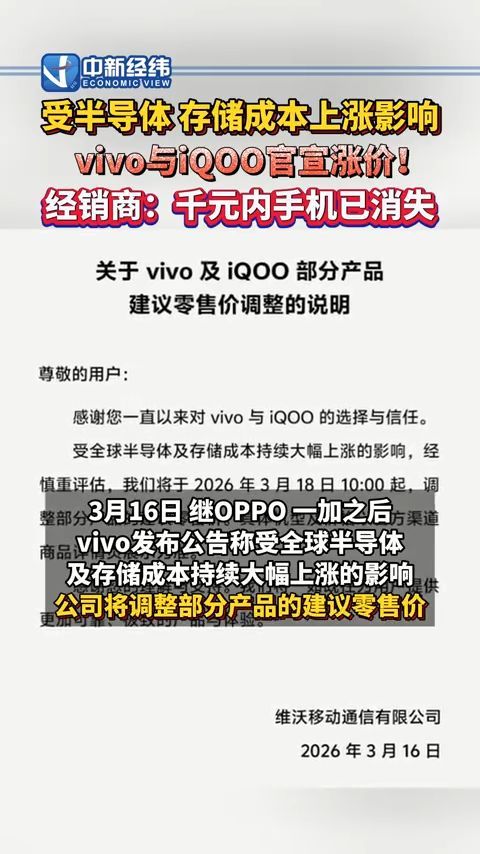 3月16日,vivo发布公告,宣布从3月18日上午10时起对vivo及iQOO品牌部分在售产品的零售价格进行调整,并表示此次调价系受全球半导体及存储成本持续大幅上涨影响。