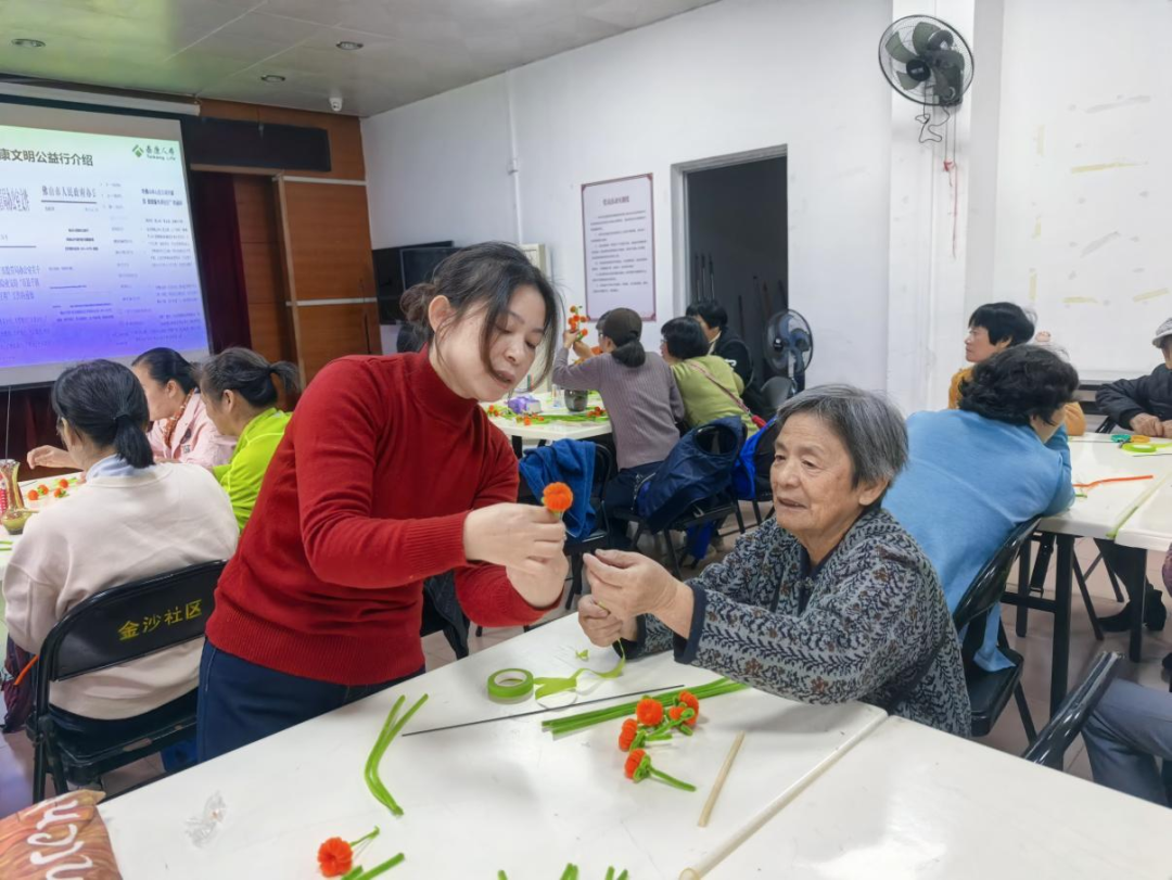 志愿者协助长者制作扭扭花。