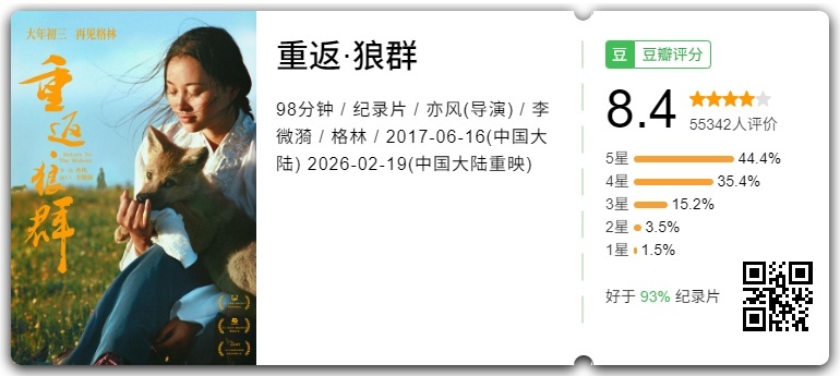 改编自李微漪同名纪实文学作品,讲述狼王遗孤“格林”被画家李微漪从若尔盖草原救回城市喂养,后因不适应城市生活被带回草原最终成功回归狼群的历程。电影于2017年上映,最近在短视频平台爆火,并于近日官宣将于大年初三(2月19日)重映。