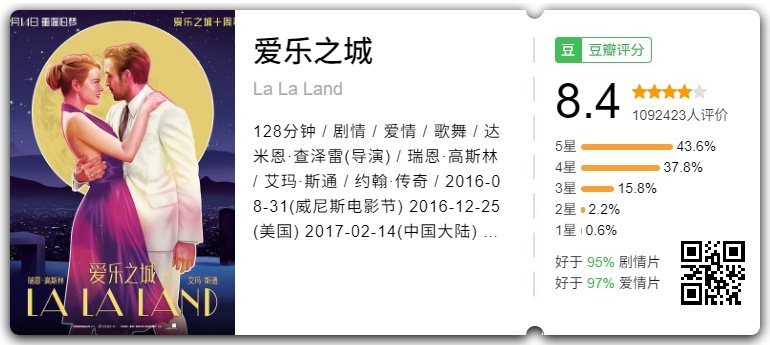 今年重映的国外影片除了上月的《闪灵》,就是这部被很多影迷奉为经典爱情片之一的《爱乐之城》,本次是它10周年重映,也弥补了很多观众当年未能进影院观看的遗憾。片子讲述了爵士音乐家Sebastian和演员Mia闯荡好莱坞的故事,浪漫之爱中透着淡淡的遗憾。