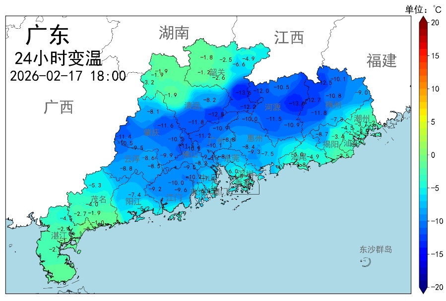 在17日白天,受冷空气影响,全省最高气温明显下降,粤北、珠三角大部市县下降10℃—15℃,湛江、茂名市下降2℃—4℃,其余市县下降5℃—9℃。