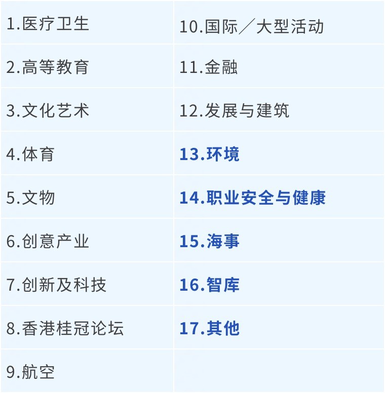 五个新增界别为环境、职业安全与健康、海事、智库,以及“其他”。增设“其他”界别可让相关决策局、部门在有需要时透过计划邀请非香港本地人才来港参加其举办、合办或支持的活动,为短期访客计划注入更大灵活性,便利非香港本地人才来港交流。