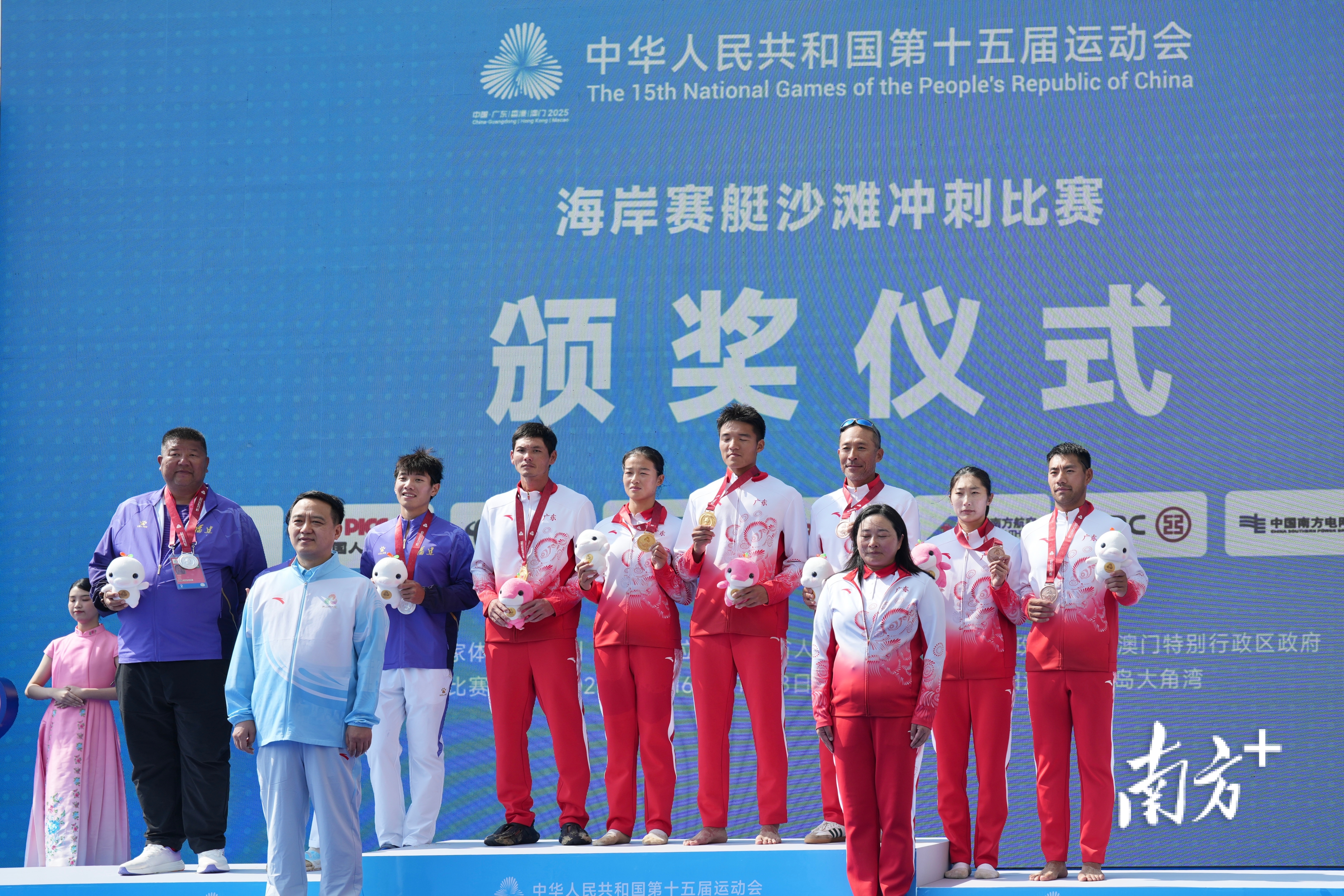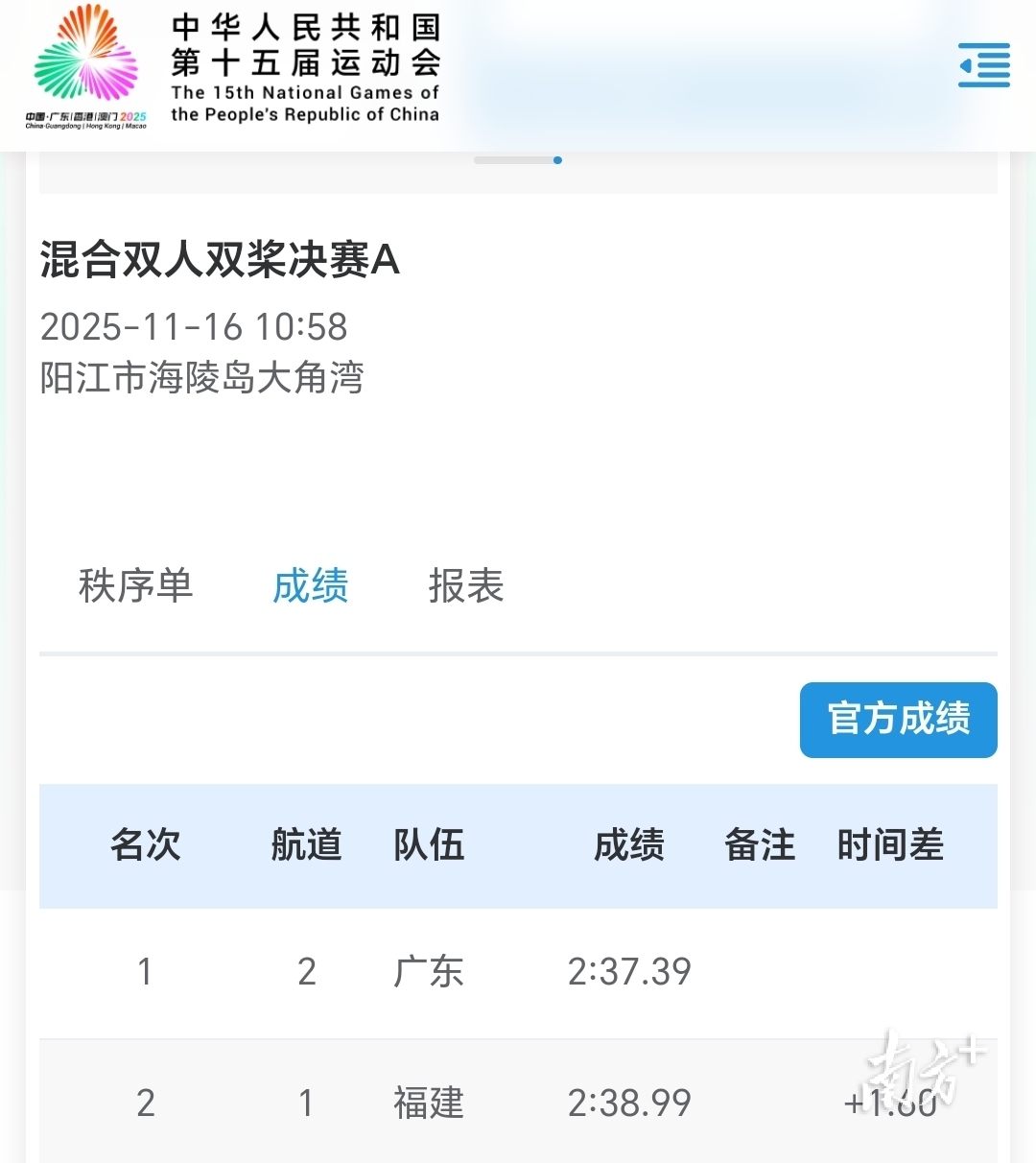 11月16日上午,在阳江市海陵岛螺洲滨海公园,第十五届全运会海岸赛艇沙滩冲刺比赛迎来历史性时刻——在混合双人双桨决赛中,广东队王云飞(男)/张桂萍(女)以1.6秒的微弱优势战胜福建队,夺得该项目冠军。这不仅是本届全运会的首枚海岸赛艇金牌,也是全运会历史上首枚海岸赛艇项目金牌。