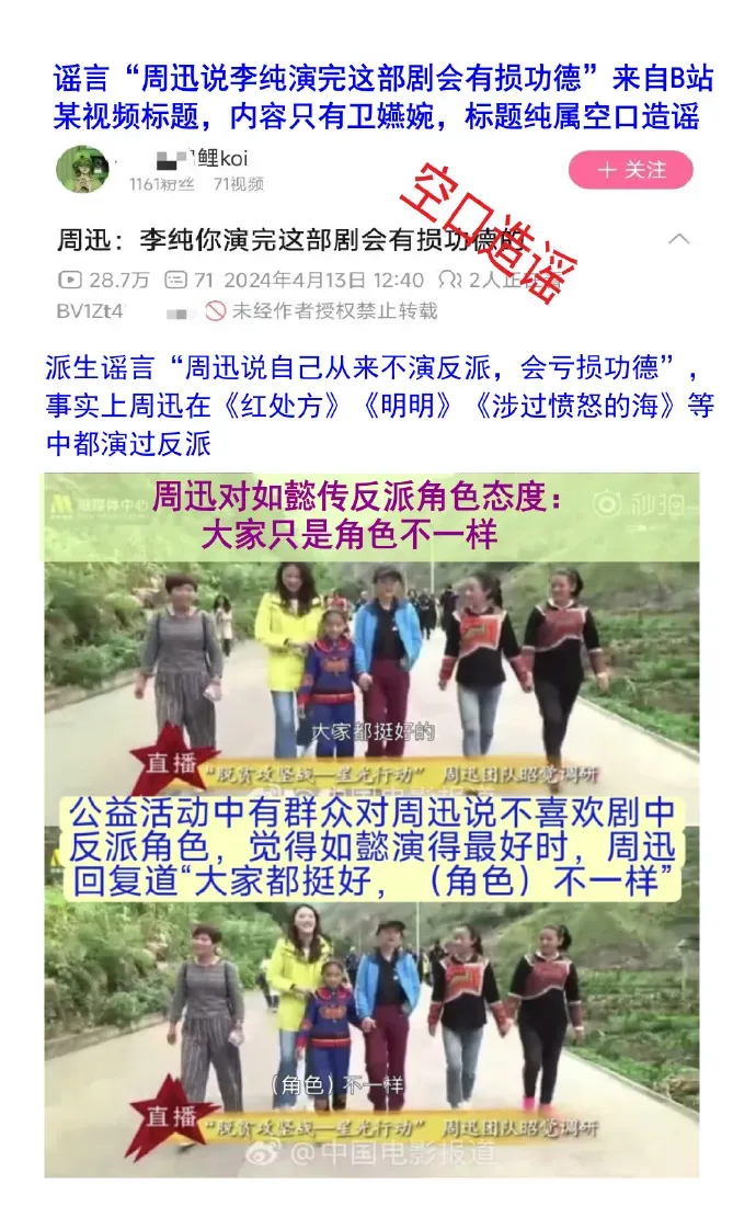 【事实】:“周迅说李纯演卫嬿婉这个角色会遭报应”为B站某用户空口造谣。一次公益活动中,周迅遇到当地群众对她说不喜欢剧中反派角色,觉得如懿演得最好时回复道:“大家都挺好的,(角色)不一样。”可见周迅对反派角色认识很理性客观。