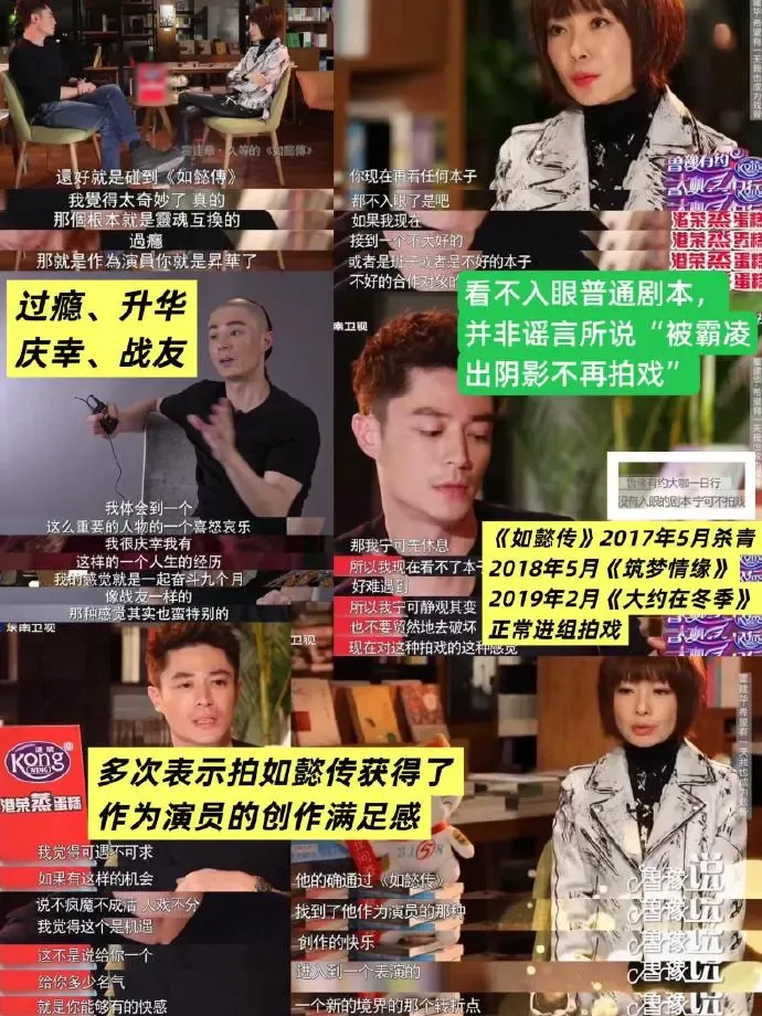 【事实】:《如懿传》2017年5月杀青,2018年8月播出。霍建华在2018年5月进组拍摄《筑梦情缘》,2019年2月拍摄《大约在冬季》。他在接受采访时感叹《如懿传》给他演员创作的满足感,对他来说非常过瘾,更是一种升华。