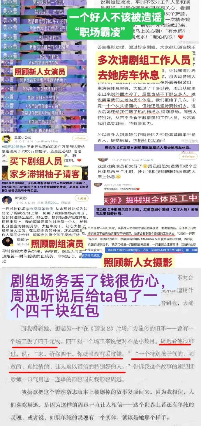 多位《如懿传》演员提到过剧组氛围有爱和谐,周迅在剧组里很照顾其他演员。周迅对职场新人和剧组普通工作人员历来也非常照顾,一个主动邀请普通工作人员上房车休息、为安慰丢钱场务送几千元红包的人,何以被如此恶毒造谣为“霸凌者”。