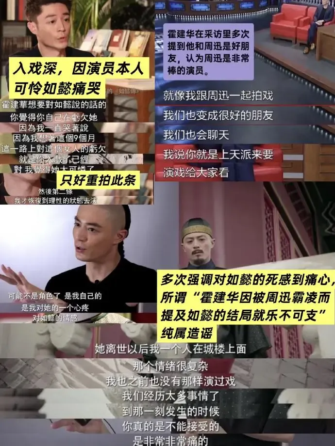 【事实】:霍建华前一夜参加剧组聚餐,休息较晚,第二天早七点一个人到片场拍摄对着已去世的前皇后(琅嬅)画像的独白戏。开拍前他担心两页台词背不下来,结果拍摄时一字不差地一条过。无论是这段采访本身内容还是涉及的那场戏,都跟周迅没有任何关系。