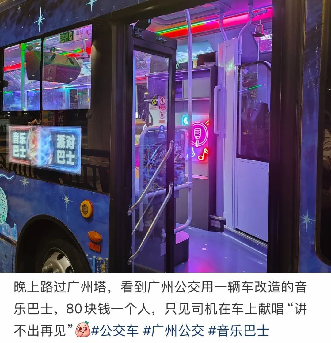 在广州,天一黑,内外闪着霓虹光的铛铛巴士,就上路开工了。从传统风的粤剧,到近景魔术和粤语金曲,辐射全年龄段客群。往广州公交车里一钻,花个几十块钱,音乐就躁起来了。