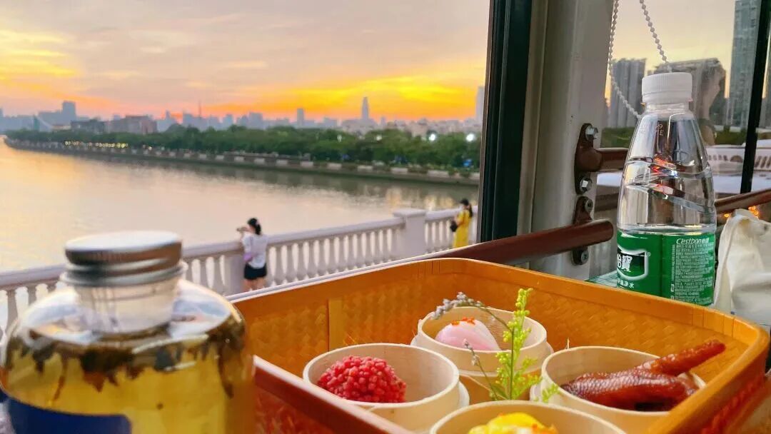 广州的双层巴士“粤陶巴”,最便宜的套餐包含8种点心、一份茶,量大到全程都吃不完。在公交车上全程一个半小时,沿途就打卡完了星海音乐厅、二沙岛、广州塔……连车内装修都是茶楼同款,满眼是古色古香的编织食盒、木格窗、软垫沙发。