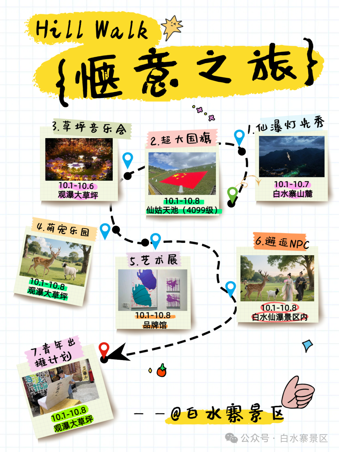【活动亮点】中秋国庆黄金周即将来袭!还没想好去哪里玩?白水寨给你安排明白了!不止有全国落差最大瀑布的登山观瀑体验,还有仙瀑灯光秀、超大国旗、草坪音乐会、萌宠乐园、艺术展、邂逅NPC、青年出摊计划这些惊喜玩法等你解锁~