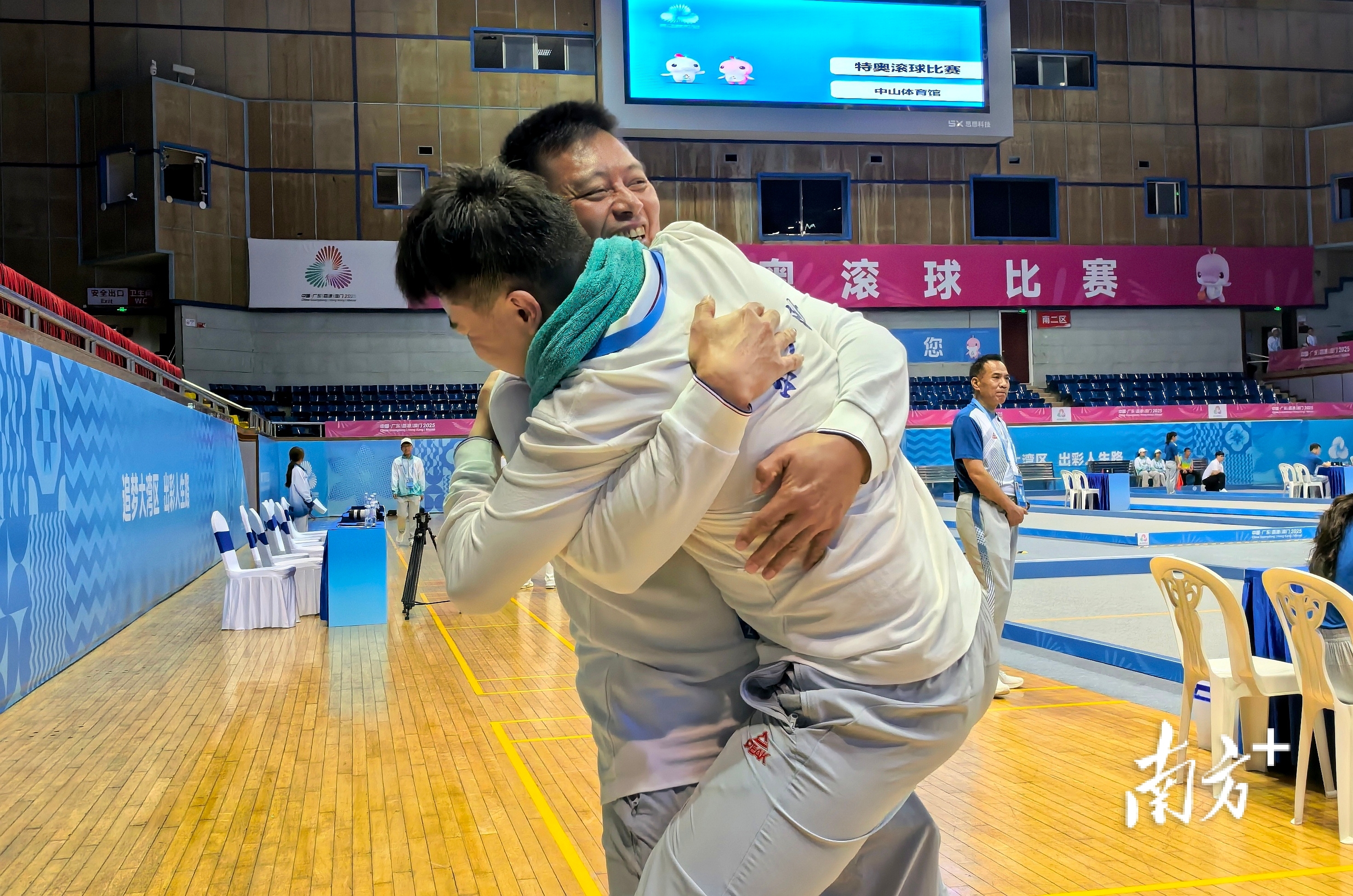 看到教练陆国盛后,他像个孩子般飞扑过去,两人紧紧拥抱,随后默契地完成了一套他们独有的、充满力量的击掌与转圈庆祝动作。