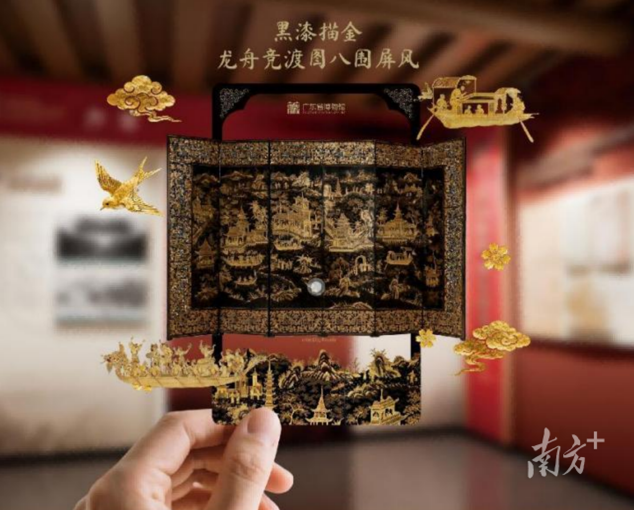 有趣的是,本次展览运用AIGC、裸眼3D、仿真建模、全息投影、AR等数字技术,打造了折屏裸眼3D动画、解密神秘大漆等多个沉浸式多媒体展项,让静态的文物活起来,让传统的广作外销漆器制作工艺得以直观展示,再现了中国金漆屏风远渡重洋,影响欧洲宫廷审美时尚的场景,为观众打造一场跨越时空的感官盛宴。展览还基于“漆画广府”“活态漆韵”主题定制AR交互透卡,观众扫描AR透卡可查看文物三维模型细节,触发工艺解析。