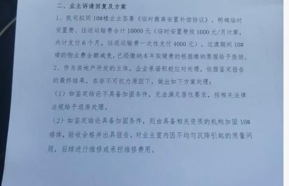 另据业主提供的开发商书面答复,拟同10号楼业主签署《临时搬离安置补偿协议》,明确临时安置费、往返运输费合计10000元(临时安置费按1000元/月计算,共计支付6个月。往返运输费一次性支付4000元),过渡期间,10号楼的物业费全额减免,已经缴纳本年取暖费的根据缴纳票据给予报销。