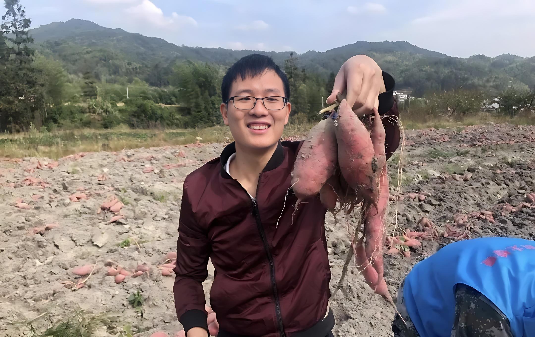 时任驻村第一书记的邓鹏辉在田间地头展示刚挖出来的红薯。