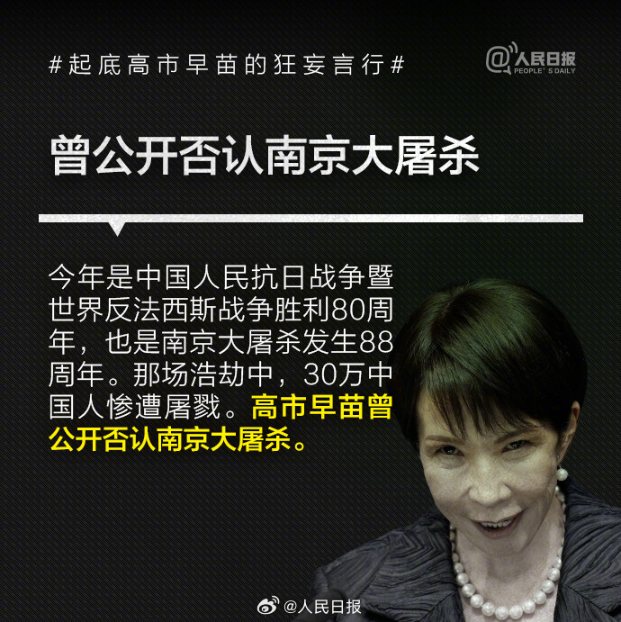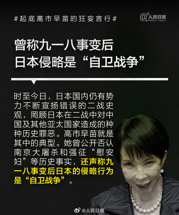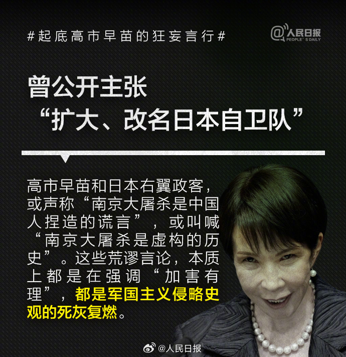 1993年高市早苗当选日本国会议员后,公开主张修改日本和平宪法、扩大和改名日本自卫队、参拜靖国神社,其言行与许多臭名昭著的日本右翼政客如出一辙。高市2014年来参拜靖国神社超10次。历史的教训岂敢忘却!我们绝不允许日本军国主义复活,破坏世界和平稳定。 编辑 佘余 订阅后可查看全文(剩余80%)