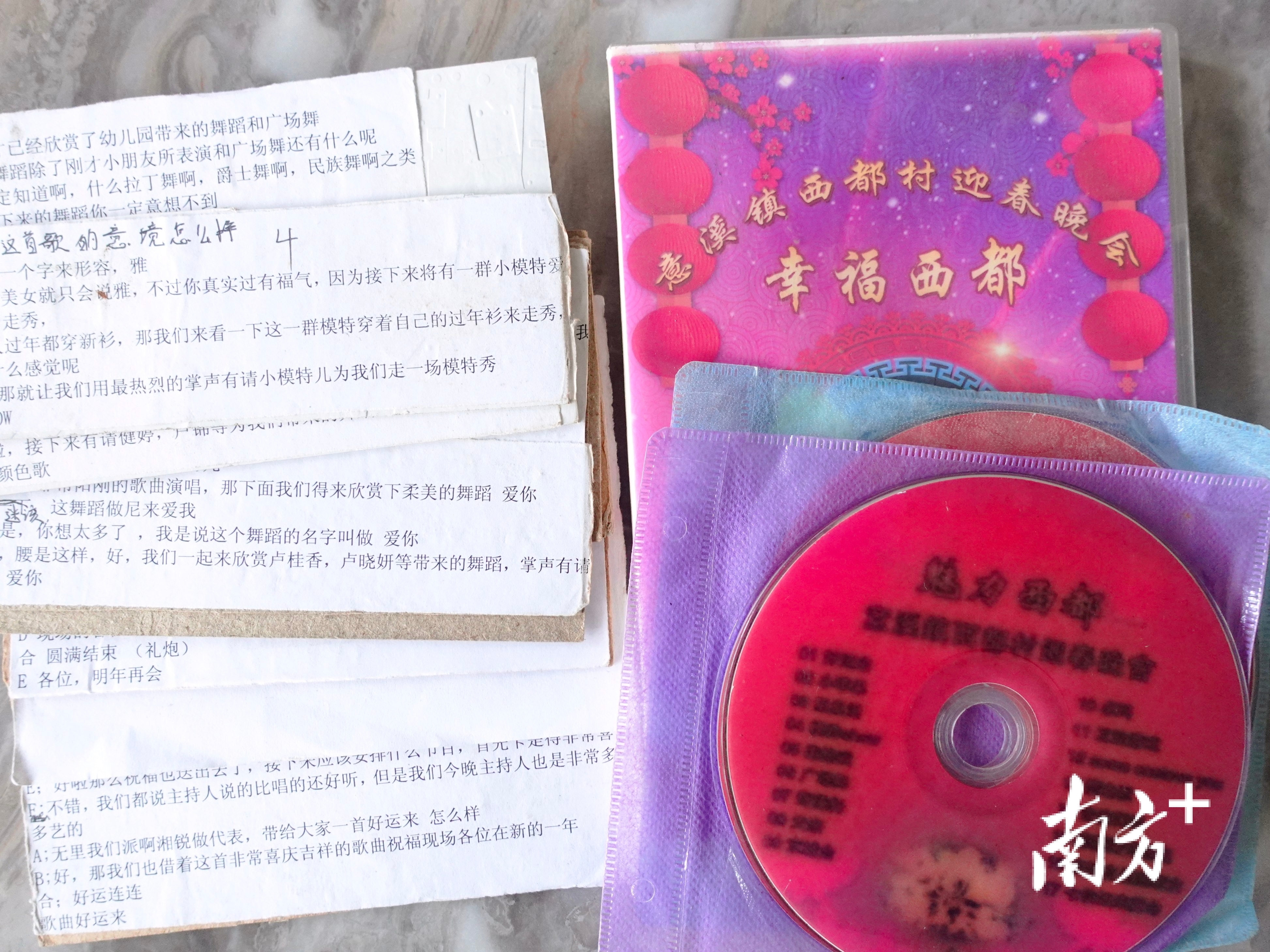 从10年前开始,他们就把街舞、现代舞、华尔兹搬上“村晚”的舞台,还请人录制晚会,刻成光盘送给参与晚会的村民。时至今日,卢湘锐的家里还留着泛黄的主持手卡,和几张陈旧的光盘。
