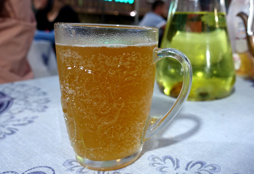 理论上,烧烤的全国官配都是啤酒,新疆也有出圈的“夺命大乌苏”。但你如果真的有机会在新疆吃,那一定不要错过本地特产冰镇格瓦斯。新疆夜市的格瓦斯,一般由少数民族摊主自行制作,放在普通的扎啤杯中看起来和啤酒无异,闻起来带着淡淡啤酒味。