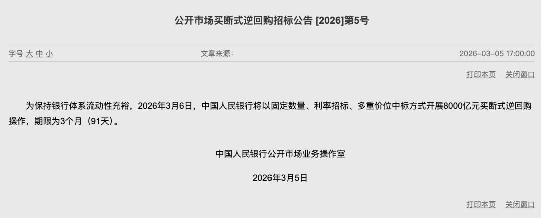 央行公告,为保持银行体系流动性充裕,2026年3月6日,中国人民银行将以固定数量、利率招标、多重价位中标方式开展8000亿元买断式逆回购操作,期限为3个月(91天)。 编辑 邓聿修 订阅后可查看全文(剩余80%)