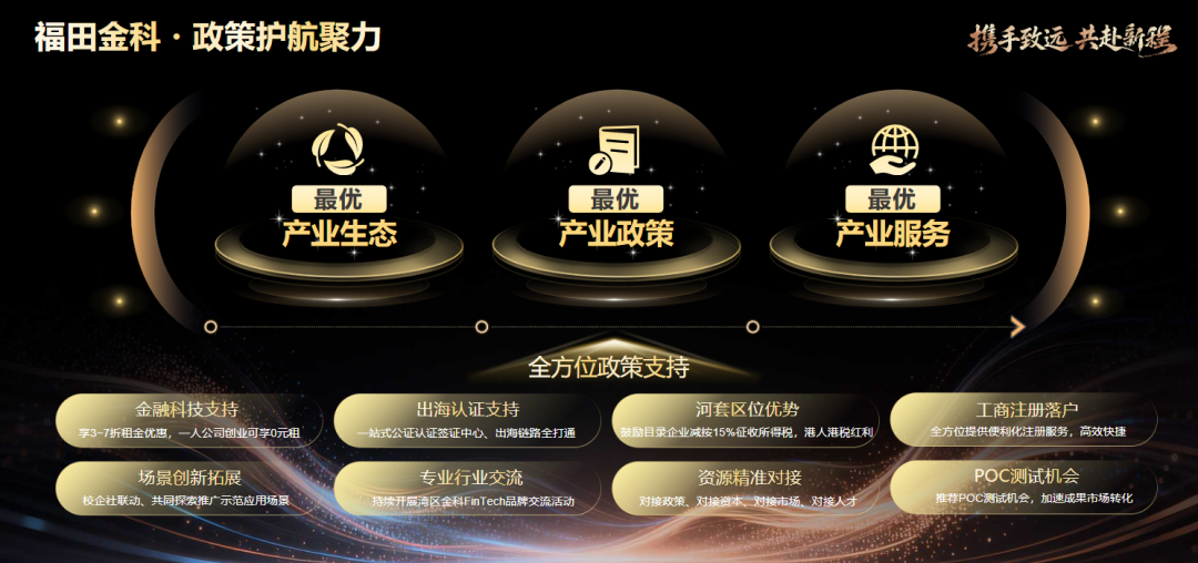 展望未来,湾区金科uni创汇港将与港深金融科技联合孵化器深度联动,依托河套深港科技创新合作区(以下简称河套合作区)的独特跨境优势,为两地初创企业提供跨境孵化、投融资对接等一站式服务,全力打造全国领先的数字金融示范场景,让“智能经济”在深港之间无缝流动。