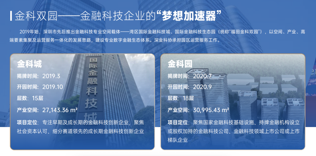 2019年,福田区打造了全国首个金融科技专业产业载体——金科城,并顺势推出金科园,形成“双园辉映”的“福田金科双园”。历经数年深耕,该园区已经成为全国金融科技生态标杆,累计汇聚近百家优质企业,其中包括31家国家高新技术企业、20家市级专精特新中小企业、5家国家级专精特新“小巨人”企业,创新活力持续迸发,产业生态成熟完备。