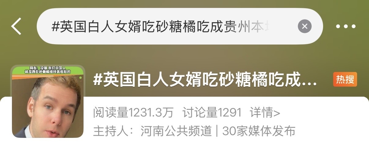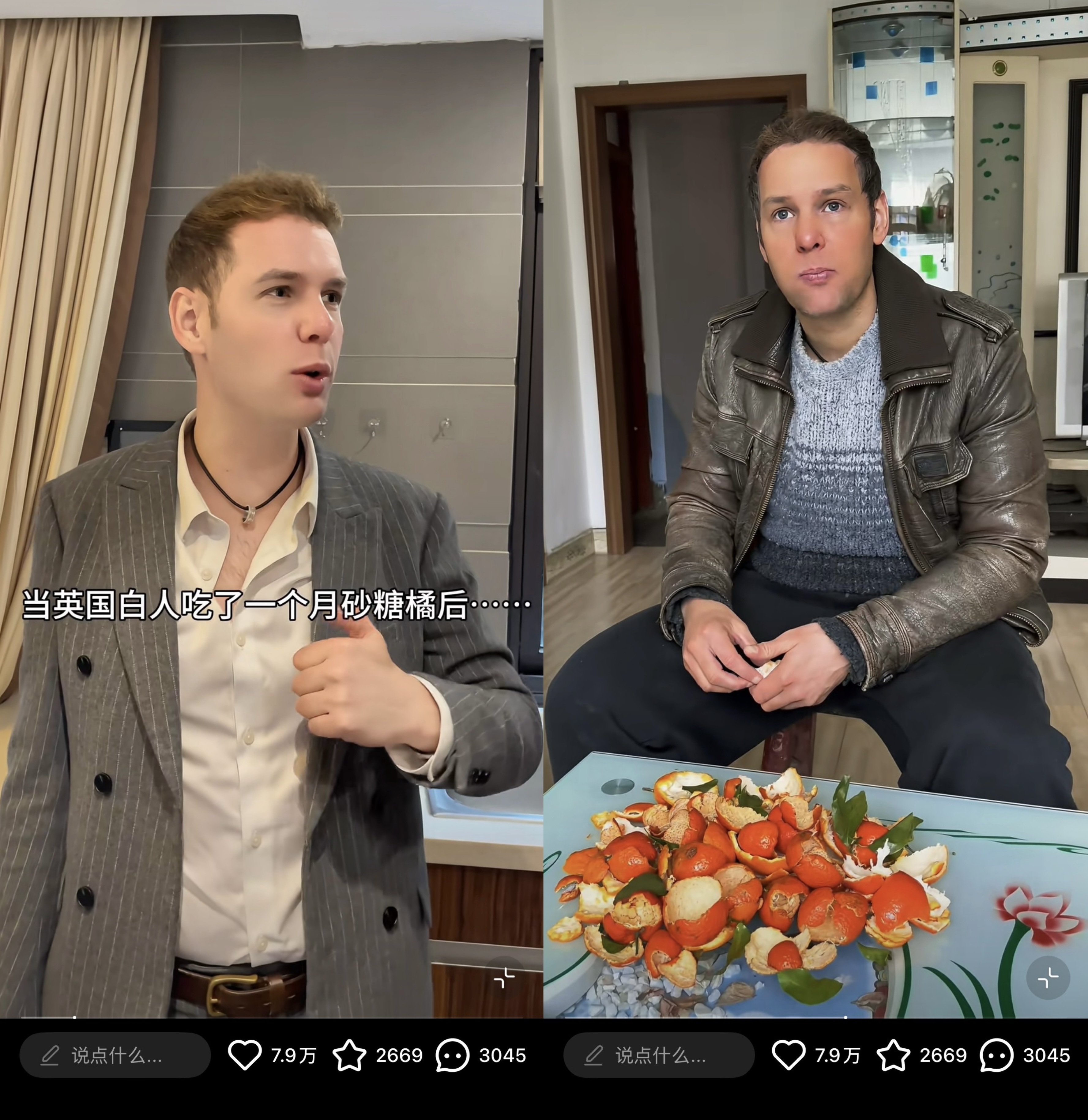 英国白人男子“狂炫”一个月砂糖橘皮肤变黄(左为一个月前,右为一个月后)。图片来源:网络视频截图。